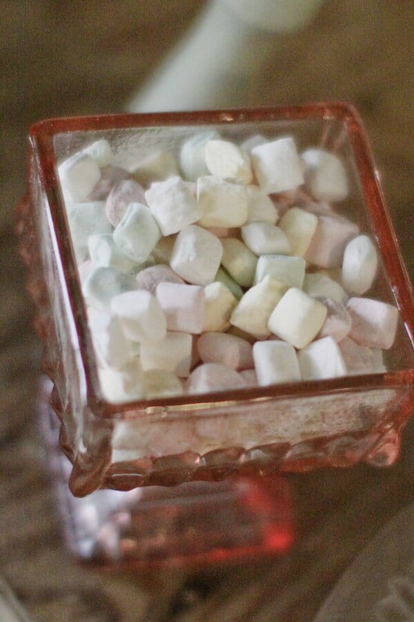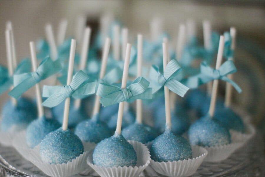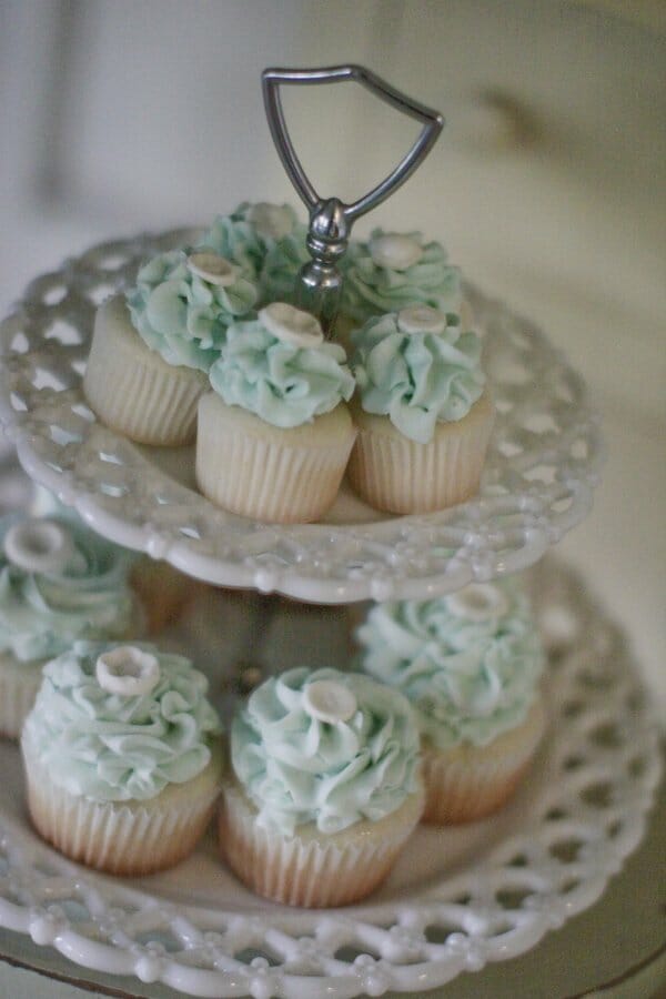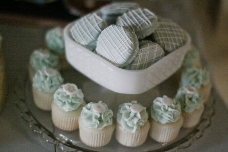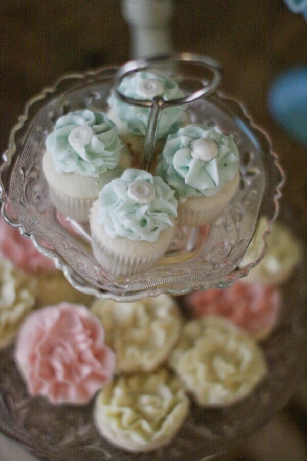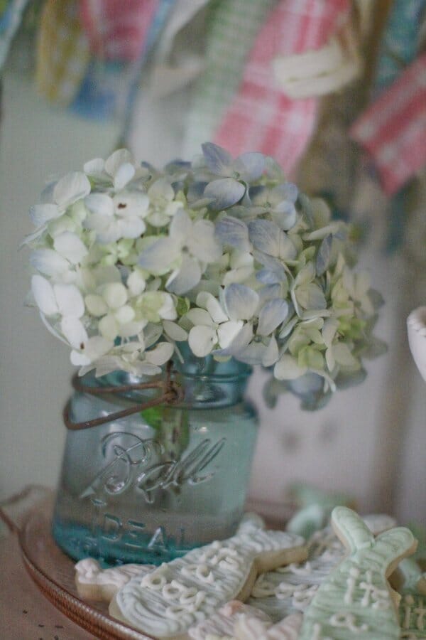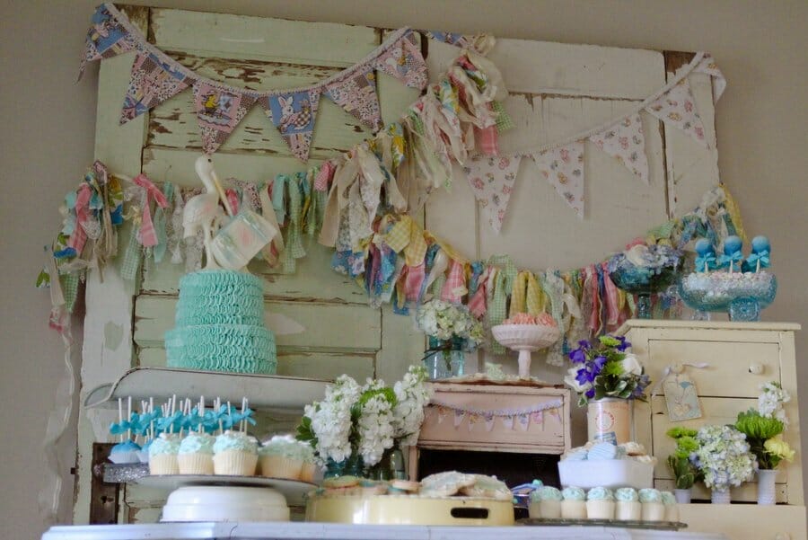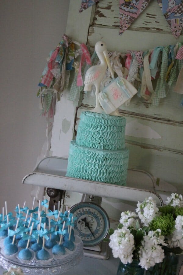 This table was so fun. I made a turquoise ribbon cake and placed it on an old baby scale, which actually worked and informed us the cake weighed 12lbs! The cookies were baby carriages, rattles, and babies in blankets. Sugared cake pops stood inside an antique glass baby carriage, topped with the iconic pastel baby shower mints. Tiny pacifiers were tied around the mini apple cobblers, and nestled inside an old tin bread box. Blue mason jars, milk glass vases and even an old baby bottle warmer held beautiful blue and white hydrangeas. I made bunting and garlands out of fabric scraps I’d scored at an estate sale, and hung them from old doors for the backdrop.