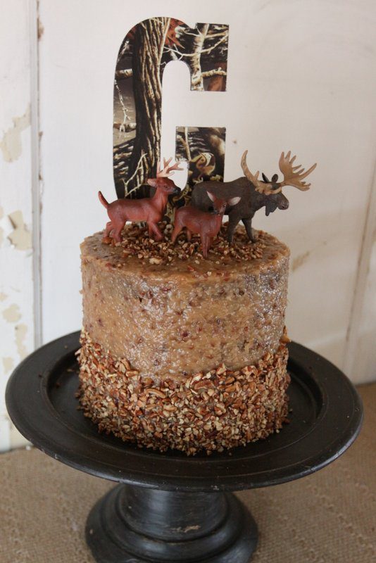 I headed to the nearest Cabella’s and found this camo “G”, and picked up these plastic deer at Michaels. For the cake, we did a german chocolate cake, then coated the sides in chopped walnuts.