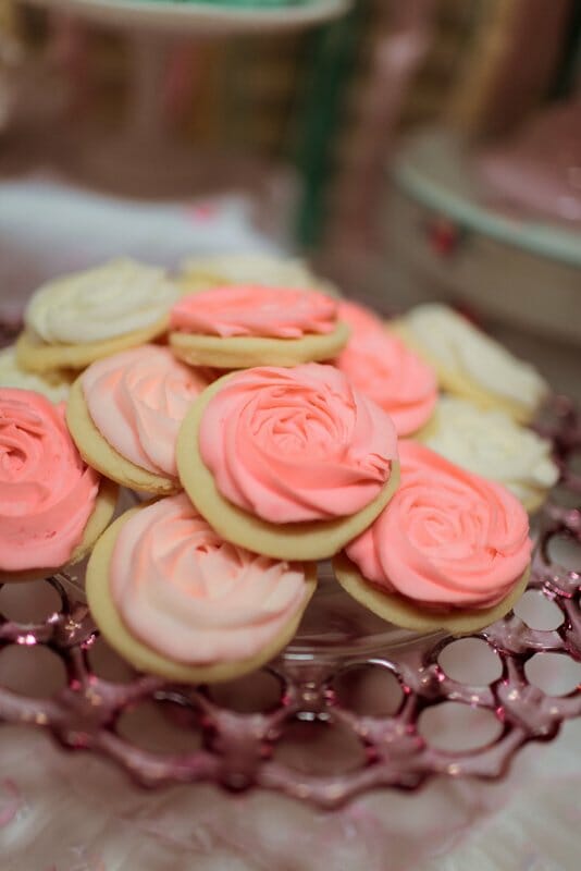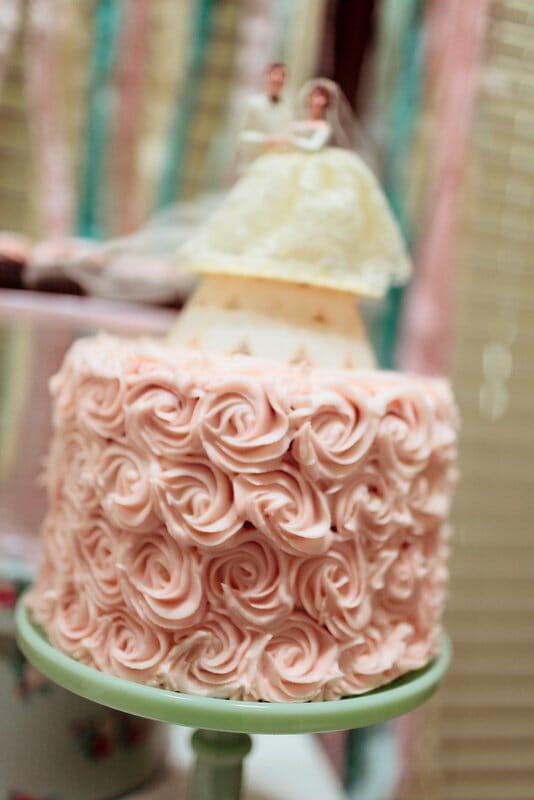This darling table was created for a bride-to-be who loved all things vintage. I had the chance to use a lot of pieces from my vintage cake topper collection. For the desserts, we did a variety of colorful cakes in different buttercream textures, along with sugar cookies, cupcakes, and cake lollipops.