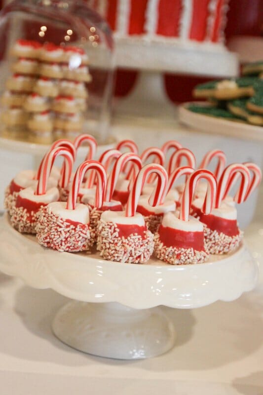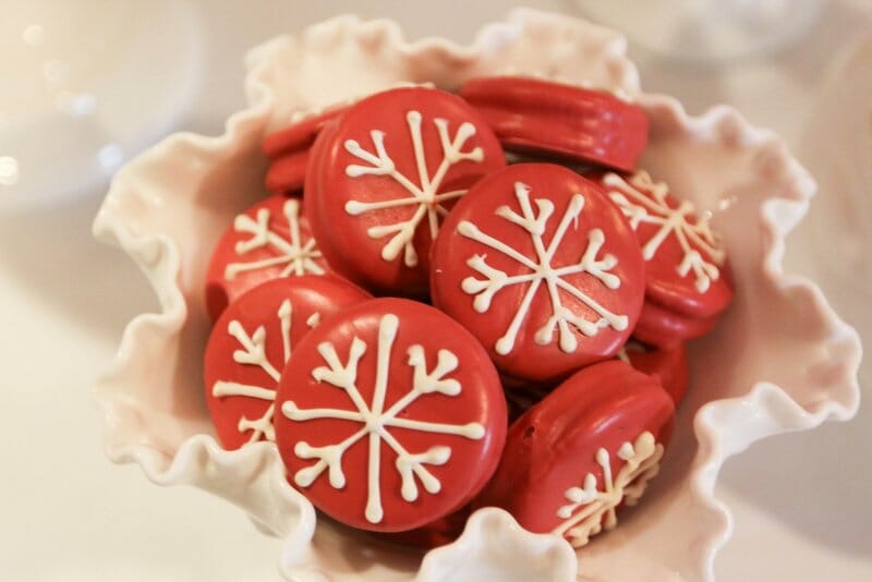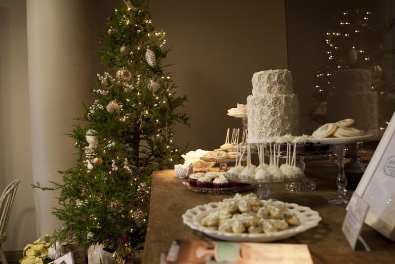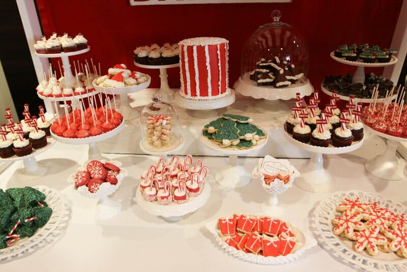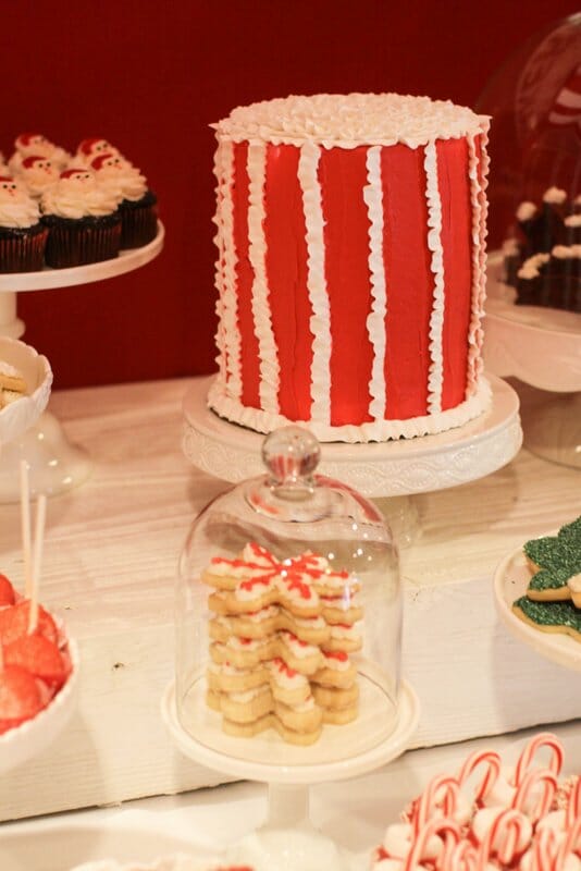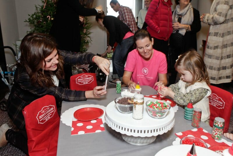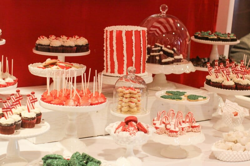 Stars gathered to benefit LA Family Housing and were treated to manicures from mom.me, photos with Santa from HP, crafts from Joann Fabrics, and cookie decorating with Jenny Cookies! In addition to our cookie decorating station, we created two dessert displays for the guests to enjoy. The mom.me lounge housed a chic white and silver dessert bar filled with snowflake sugar cookies, snowball cookies, sparkly cake pops, coconut cupcakes, and our signature rose cake. In the main room, we created a North Pole Bakery dessert table overflowing with holiday themed desserts such as red velvet brownies, candy cane marshmallows, Christmas tree rice krispy treats, holiday fudge, oreo cake lollipops, santa hat sugar cookies and more.