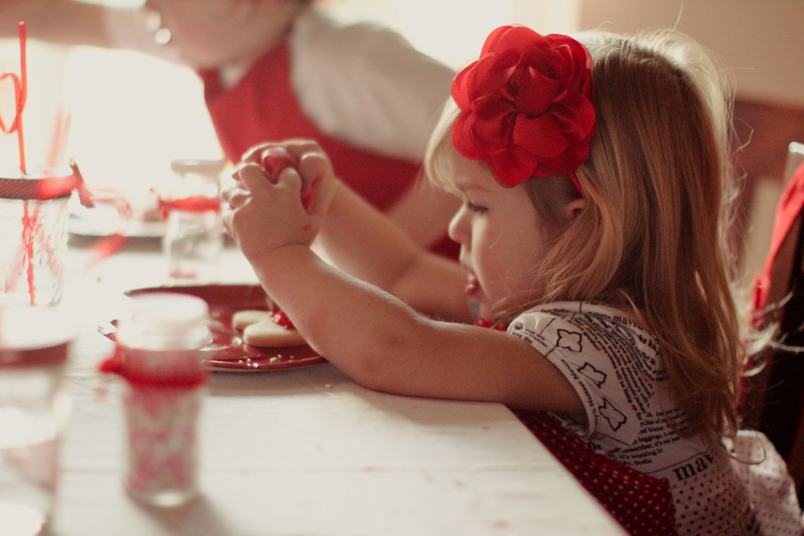 So last year, while Dan watched the Superbowl, I baked and set up a fun Valentine’s Day cookie decorating table, vintage valentine themed. I invited a couple of my friends and their children over for a heart shaped pizza lunch and an afternoon of buttercream icing and sprinkles.