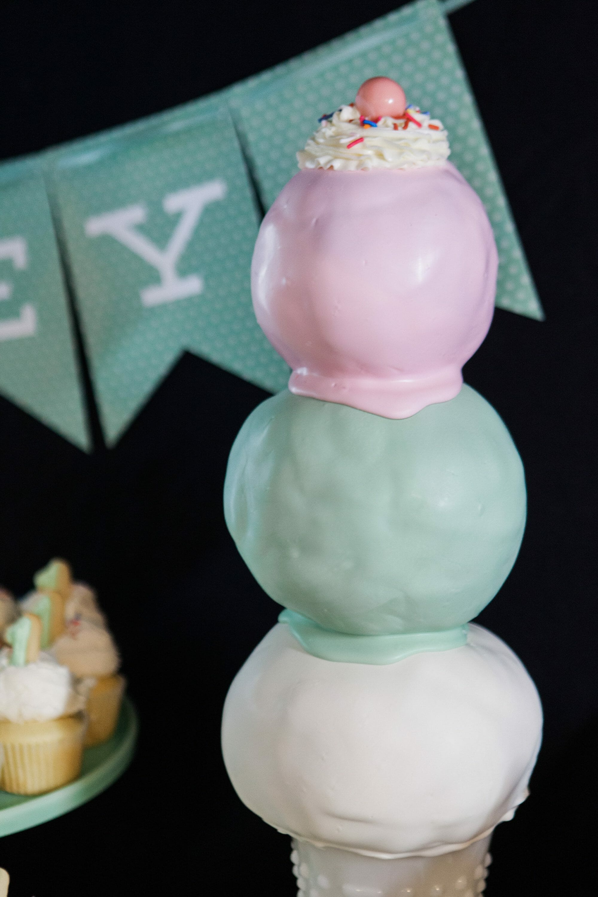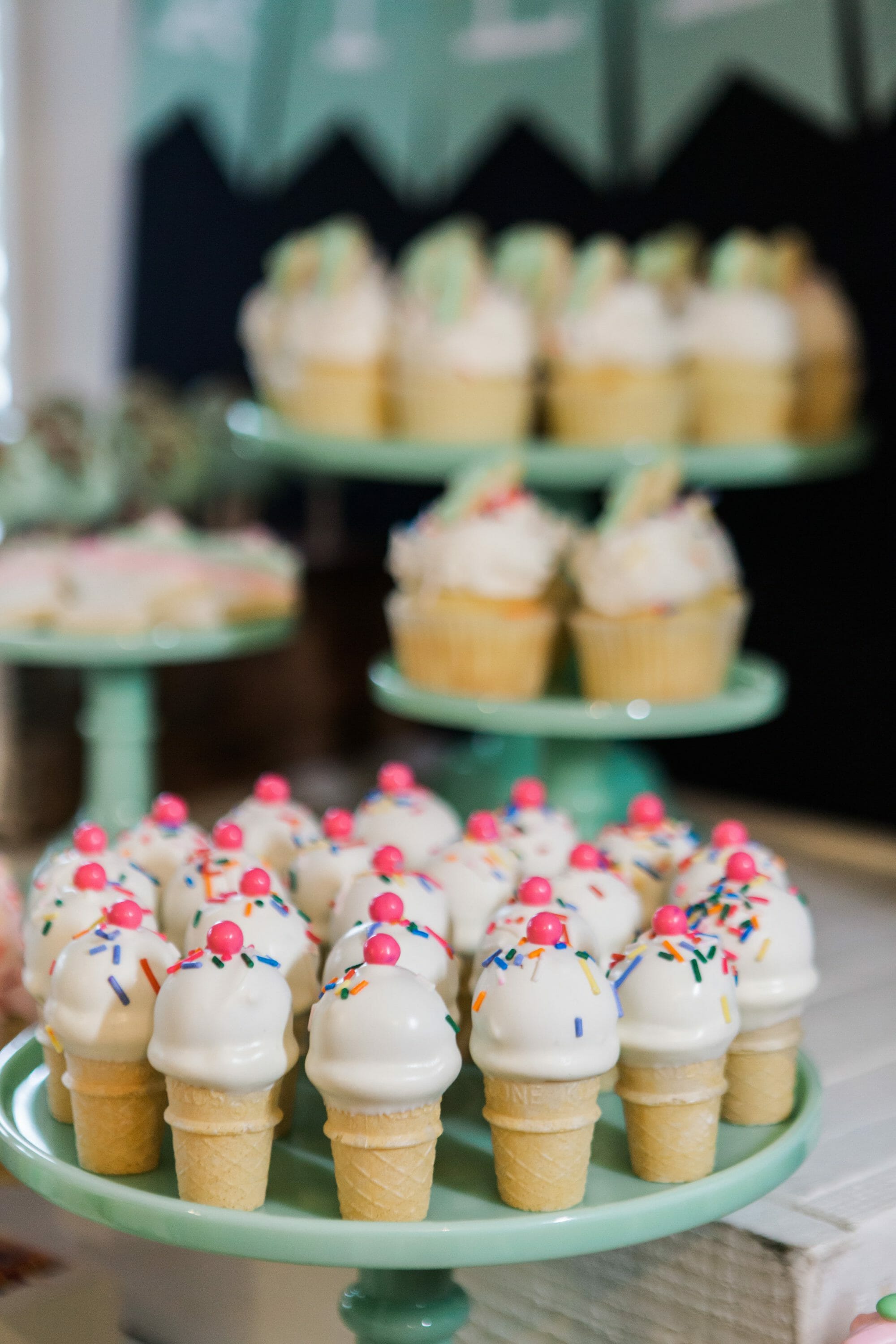 To coordinate Molly’s color scheme into the dessert table, I created an ICE CREAM SHOP themed table for little Riley, complete with a black and white striped fabric awning with a giant 3-scoop ice cream cone cake! I baked cupcakes topped with “scoops” of buttercream, ice cream cone cake pops, sugar cookies shaped as ice cream sundaes, brownies as ice cream sandwiches and waffle cup hot fudge sundaes with melted chocolate! Minted created an adorable personalized banner for the table and cupcake flags that were perfect for the wooden spoons in the hot fudge sundaes. Cookies and cupcakes sat atop my favorite jadite colored cake plates and vintage wooden drawers and boxes held ice cream cone cake pops and rice krispy treat ice cream bars. It turned out super cute!