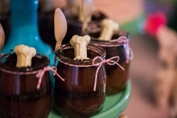 Since you only turn four once, we decided to get crazy and make Simone four cakes. To top Simone’s largest cake, we had a topper custom designed from Communicake It. I’m in LOVE with their toppers!! They are made from wood, and make amazing party keepsakes. For cookies, I found about 8 different size puppy and bone shaped cookie cutters and went nuts decorating puppies in buttercream! The large bone cookie cutters were perfect for cutting rice krispy treats and the minis were just the right size for baking teeny tiny bone cookies to top my pudding cups. (I found the adorable glass jars at TomKat Studio) In addition to the cakes and cookies, I made everyone’s favorite dipped pb cracker cookies (recipe in my new book EAT MORE DESSERT) and drew paw prints on each with melted chocolate from GYGI. I swear by their melting chocolates!! My cake pops come out smooth every time and their assortment of colors are awesome. (I also found the adorable pink, green and yellow candies the cake pops are standing in, on their site.)