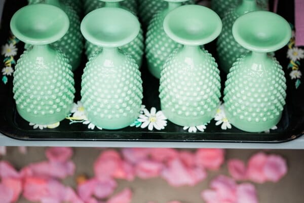 Scout set a darling food table with his collection of vintage tableware and sprayed dog bones with spray paint to create puppy bone banners. They turned out so cute. He also sprayed huge letters found at a craft store and displayed them on the food and drink station. Sarah from Paper White Designs made the most incredible twirls that were hung behind the drink station and photo booth area.