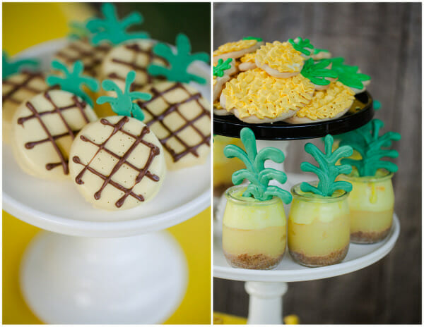 I couldn’t help but bake a few desserts for the table so I made everyone’s favorite peanut butter cracker cookies shaped and decorated as pineapples, pineapple shaped sugar cookies, cupcakes with chocolate glittered pineapple toppers, and my favorite, mini lemon meringue pies made in these miniature jars. SO easy to make, I just drew pineapple stems with melted green candy onto waxed paper and topped the pies with the stems. Poof, pineapple pies!
