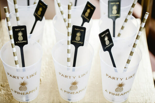 I found these fun pineapple cups at Oriental Trading Company and just added black and white stripe straws to coordinate our theme. And for the men who didn’t want to drink out of plastic pineapples, my friend JoAnne of Oh Goodie Designs custom designed chic Party Like a Pineapple cups drink stirs and coasters! Obsessed!