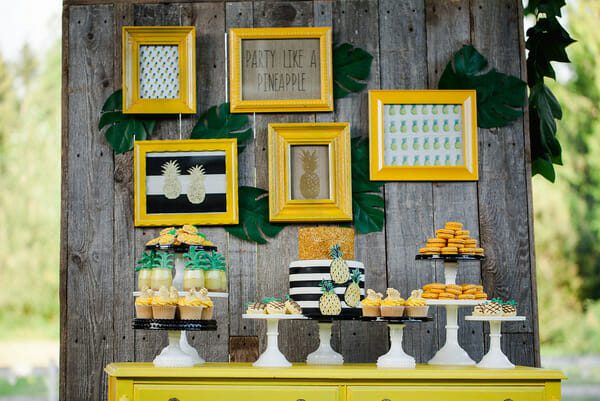 My friend Kim from TomKat Studio sent me the cutest gold glitter pineapple garland that I used all over the party. I filled in two frames with the glitter pineapples as well as a cute banner on the food table.