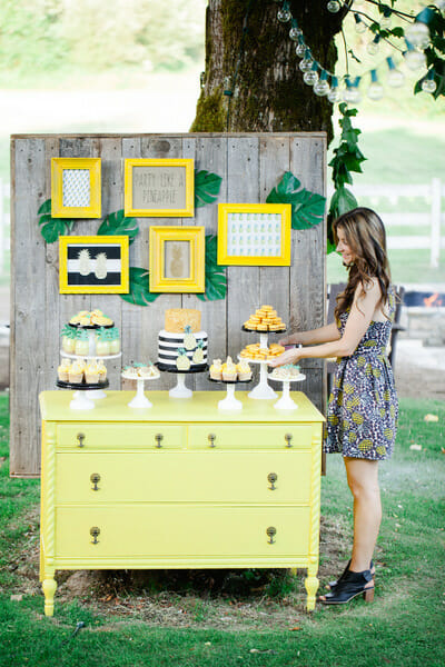 We had a bit of a dilemma when it came to the backdrop. I had ordered Party Like a Pineapple lit marque lights to hang behind the table. They were absolutely stunning. Except..they didn’t arrive until Saturday. Not helpful when your party is Friday night. So with an hour to spare before guests arrived, I pulled down the frames and backdrop from my daughter Ally’s kitten party, grabbed my can of yellow spray paint, and went to work. Thank goodness I had extra glitter pineapples and prints from Piece Love Paper and TomKat Studio! My sister had come to help set up so between the two of us, we literally framed a party napkin, cut a striped table runner, framed the back of the invite, and stapled a few left over palm leaves from the photobooth backdrop. Improvise may as well be my middle name.