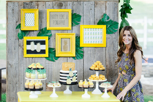 I always start with the invitation to begin party planning, I mean, ahem, Dan started with the invitation. Since there was nothing besides the pineapple housewarming line, we asked Harper Gray Designs if they could design a Party Like a Pineapple invite with black and white stripes, gold, mint green, and of course yellow. They nailed it.