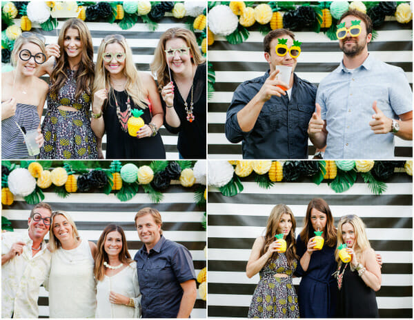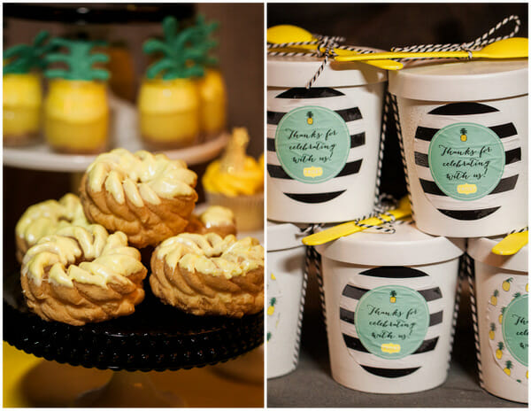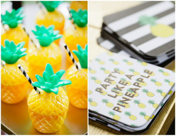 I found these fun pineapple cups at Oriental Trading Company and just added black and white stripe straws to coordinate our theme. And for the men who didn’t want to drink out of plastic pineapples, my friend JoAnne of Oh Goodie Designs custom designed chic Party Like a Pineapple cups drink stirs and coasters! Obsessed!
