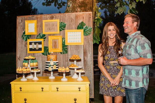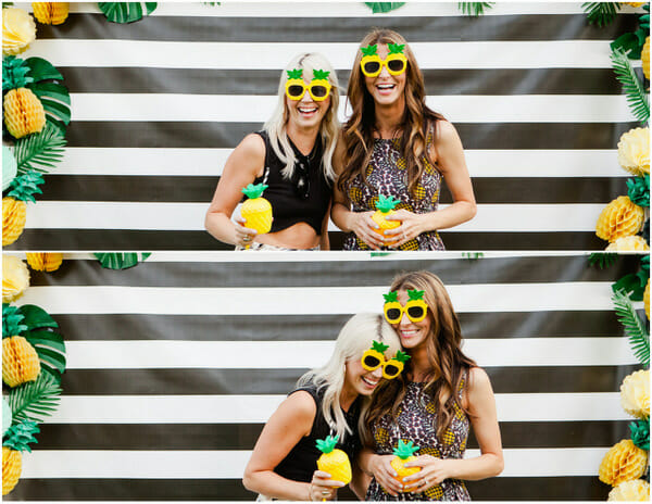 We had a bit of a dilemma when it came to the backdrop. I had ordered Party Like a Pineapple lit marque lights to hang behind the table. They were absolutely stunning. Except..they didn’t arrive until Saturday. Not helpful when your party is Friday night. So with an hour to spare before guests arrived, I pulled down the frames and backdrop from my daughter Ally’s kitten party, grabbed my can of yellow spray paint, and went to work. Thank goodness I had extra glitter pineapples and prints from Piece Love Paper and TomKat Studio! My sister had come to help set up so between the two of us, we literally framed a party napkin, cut a striped table runner, framed the back of the invite, and stapled a few left over palm leaves from the photobooth backdrop. Improvise may as well be my middle name.