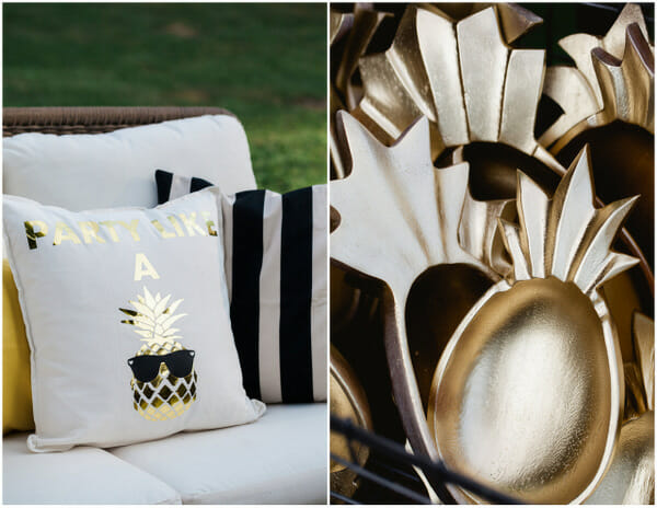 I found the most fantastic shiny gold pineapple pillows from this darling shop Fancy it Pretty. She was a treat to work with, and even custom designed this Party Like a Pineapple pillow! They are going to spend the rest of the summer on my sofa. So fun!