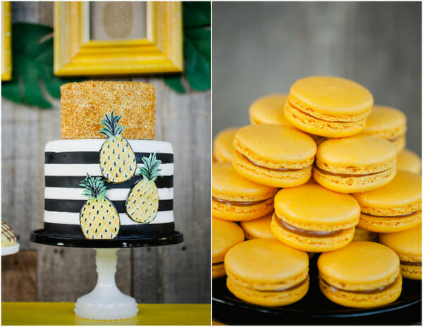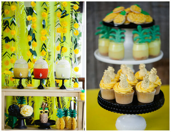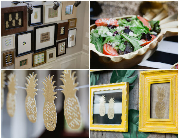 My friend Kim from TomKat Studio sent me the cutest gold glitter pineapple garland that I used all over the party. I filled in two frames with the glitter pineapples as well as a cute banner on the food table.