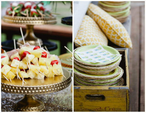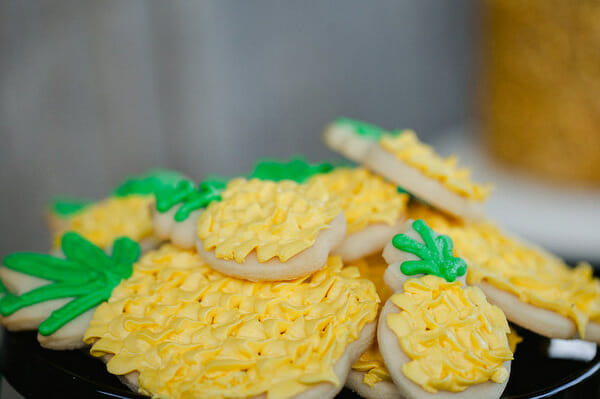 I couldn’t help but bake a few desserts for the table so I made everyone’s favorite peanut butter cracker cookies shaped and decorated as pineapples, pineapple shaped sugar cookies, cupcakes with chocolate glittered pineapple toppers, and my favorite, mini lemon meringue pies made in these miniature jars. SO easy to make, I just drew pineapple stems with melted green candy onto waxed paper and topped the pies with the stems. Poof, pineapple pies!
