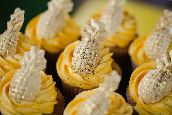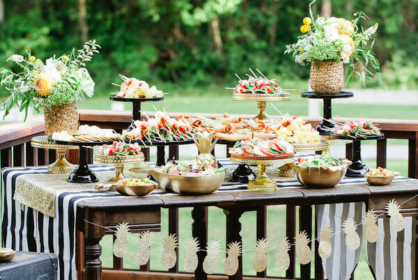 For food, we tried a new caterer in our area, Katyas. Katyas created a delicious spread of pineapple themed apps (ham & pineapple skewers, pineapple caprese salad, pineapple mango salsa, etc). All the food was displayed on black and white, yellow, and you guessed it, gold spray painted cake plates.