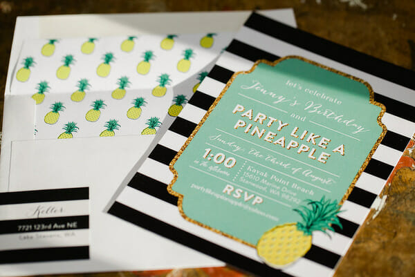 I always start with the invitation to begin party planning, I mean, ahem, Dan started with the invitation. Since there was nothing besides the pineapple housewarming line, we asked Harper Gray Designs if they could design a Party Like a Pineapple invite with black and white stripes, gold, mint green, and of course yellow. They nailed it.