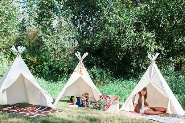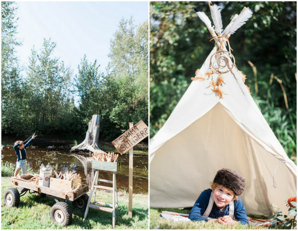 To set up Hudson’s camp, I used three BE Little You and Me teepees and attached feathers to the poles and laid blankets inside for the kids. Big hit with the littles. These teepees are SO easy to set up and incredibly versatile for boys or girls!