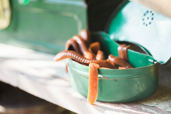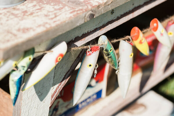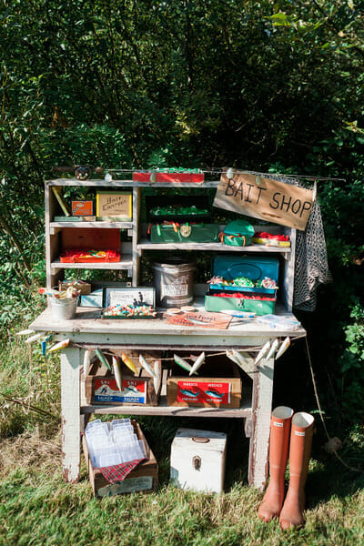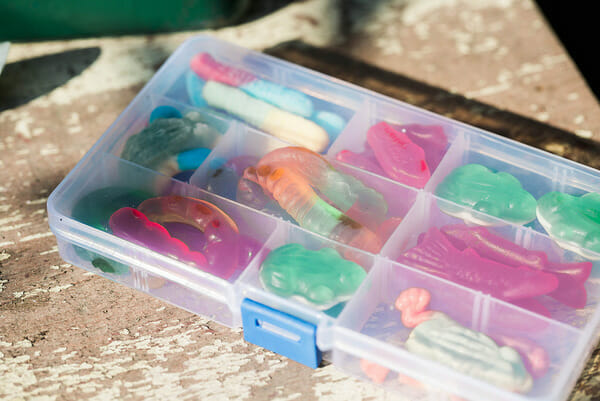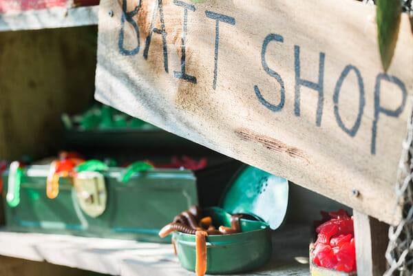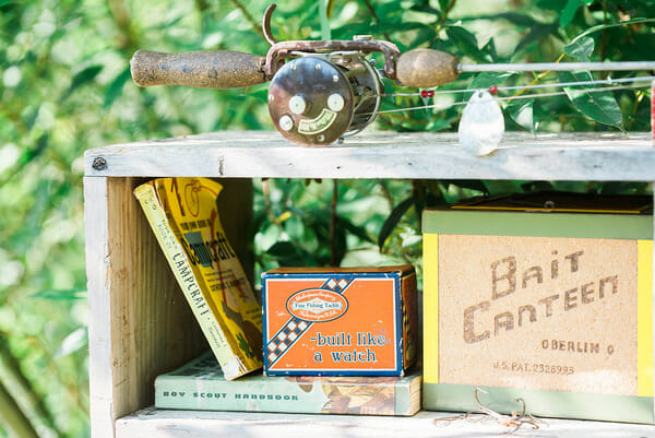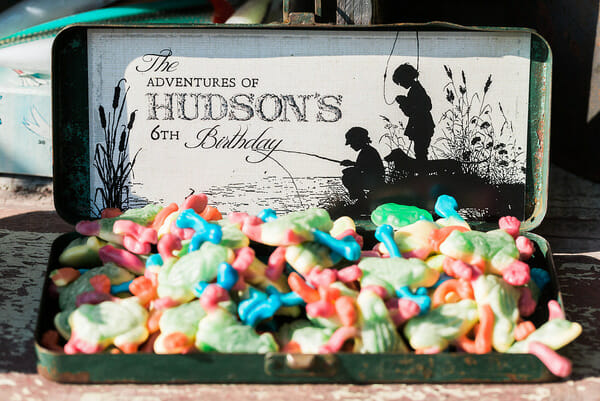 Even though we couldn’t fish, I still had a bait shop for the kids, aka candy bar. I had found this old garden bench for next to nothing at a vintage shop nearby that was perfect for the “bait”. Filled with gummy worms, frogs, swedish fish, and eggs, the kids LOVED filling their tackle boxes.