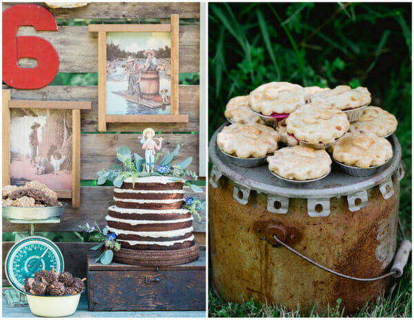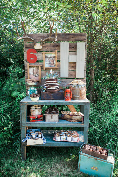 I had the majority of the party goodies stored up in my infamous prop attic but did spend a day antiquing on our family vacation and picked up some fun new things for his party. My husband was less than thrilled when I announced I had purchased an old green shelf that had to be loaded into his truck and travel with us for the duration of our vacation. I convinced him it would make the perfect dessert table….and it did. We attached an old wood pallet to the back of the shelf and hung antlers, a #6, a rustic wood “H”, and two old Tom Sawyer and Huck Finn prints I found on etsy. It was darling.