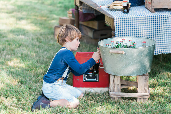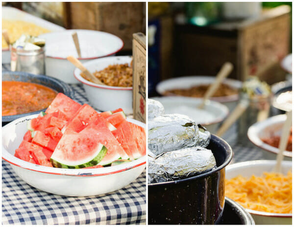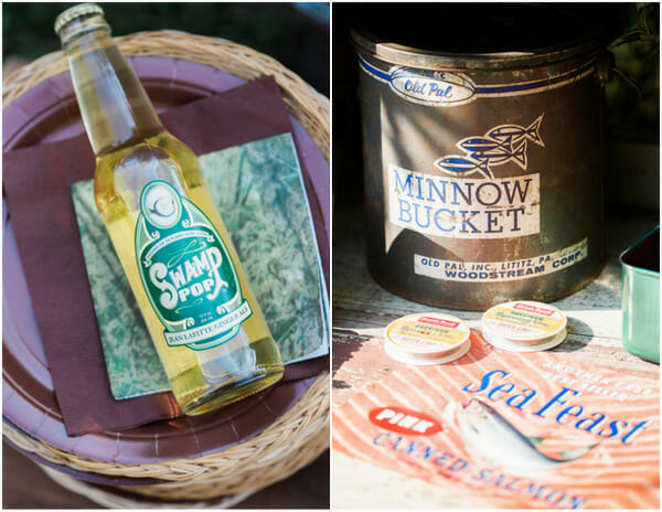 We threw the party on a Sunday night at 5pm, which probably sounds weird, but I really love a Sunday party. And to beat the heat of the day, we decided on 5pm which meant serving guests dinner. In Huck Finn style, we offered a baked potato bar with every topping imaginable (chili, baked beans, mac & cheese, pulled pork, etc) displayed in vintage enamelware. For drinks we had old fashioned bottled soda and “Swamp Pop”.