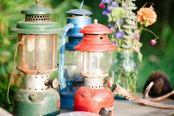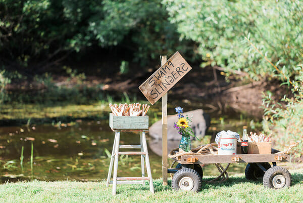 We had originally planned on planting real fish in our pond for the kids to “fish” but unfortunately we’d experienced a crazy hot summer and our pond was nearly dry. Instead, I found inexpensive sling shots (every little boy’s dream), set vintage cans and bottles out on a huge tree stump in the middle of the pond, and gave the kids a bucket of marshmallows to sling. This was a hit with not only the kids…but the dads who attended the party as well.