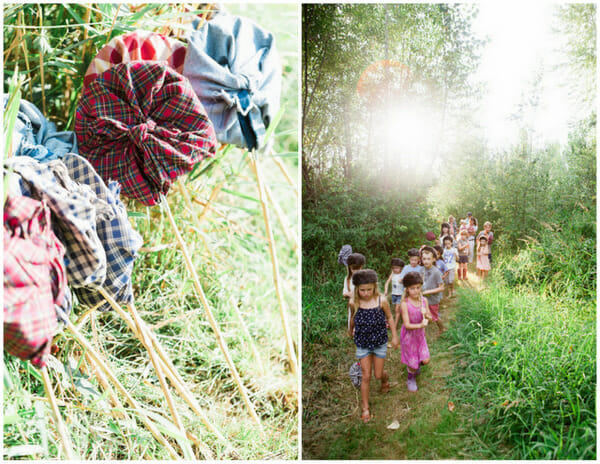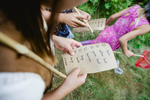 Since the party was held at our farm, we had five acres to work with. My husband blazed a fun trail for the kids before the party while I compiled a nature scavenger hunt list. I had found nets at the dollar store a few months back and had tucked them away for Hudson’s party. They were perfect for our hunt. I filled the nets with a few snacks (hikers get tired!), their scavenger hunt list, and tied them up in fabric making an old fashioned nap sack.