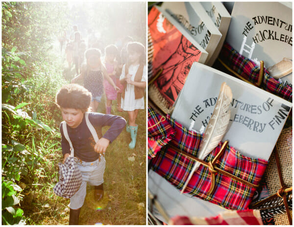 Target always does me right. Without fail, the dollar spot had the perfect party favors. The Adventures of Huckleberry Finn and Tom Sawyer books for ONE DOLLAR. I wrapped each book with strips of plaid flannel tied with leather and tucked in a feather.
