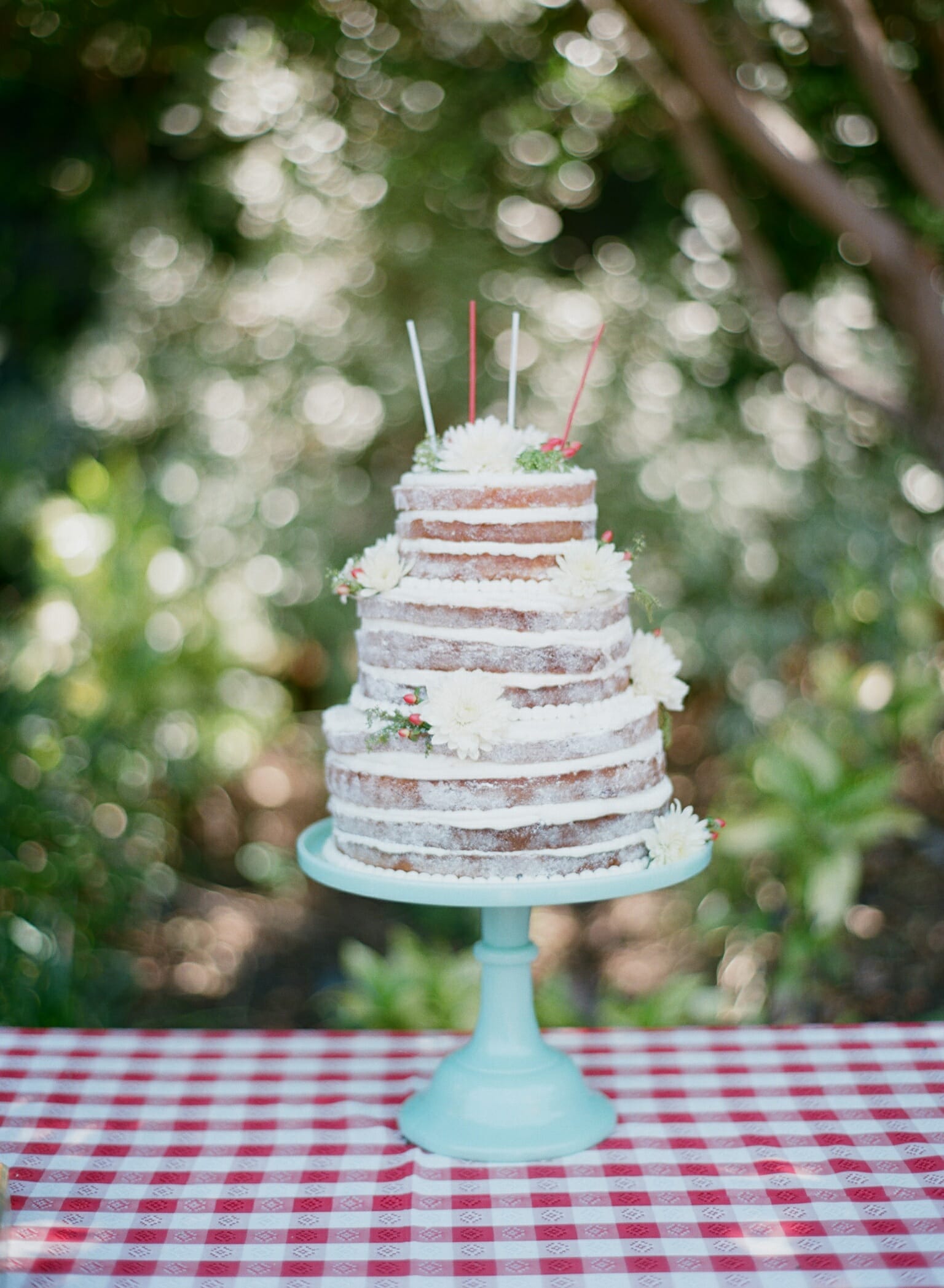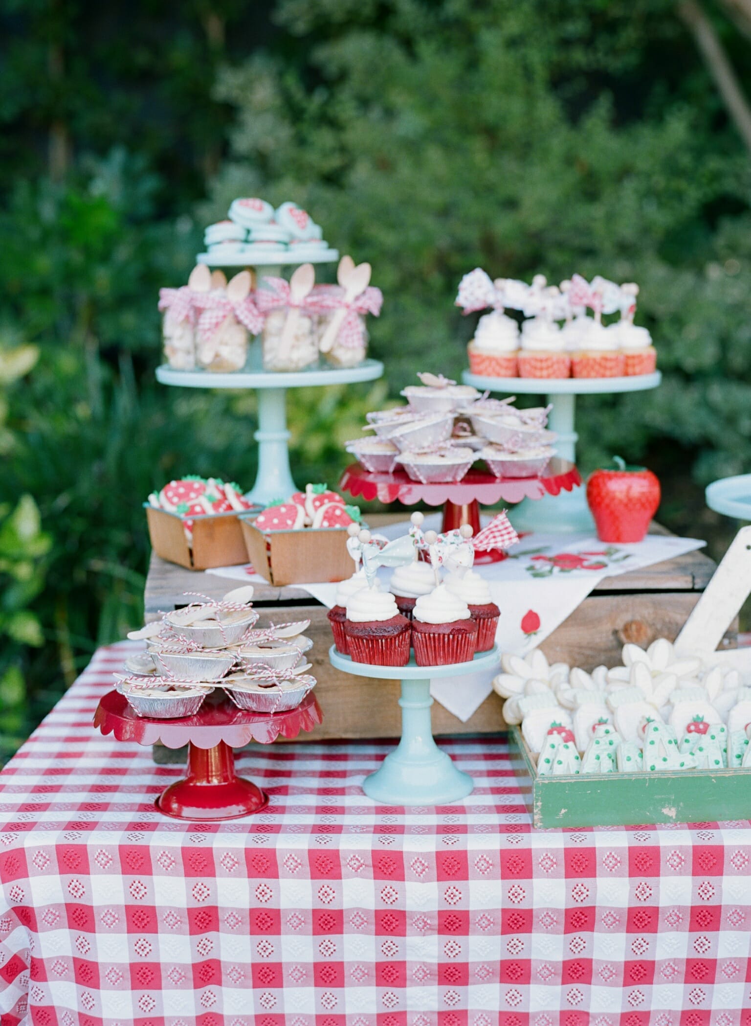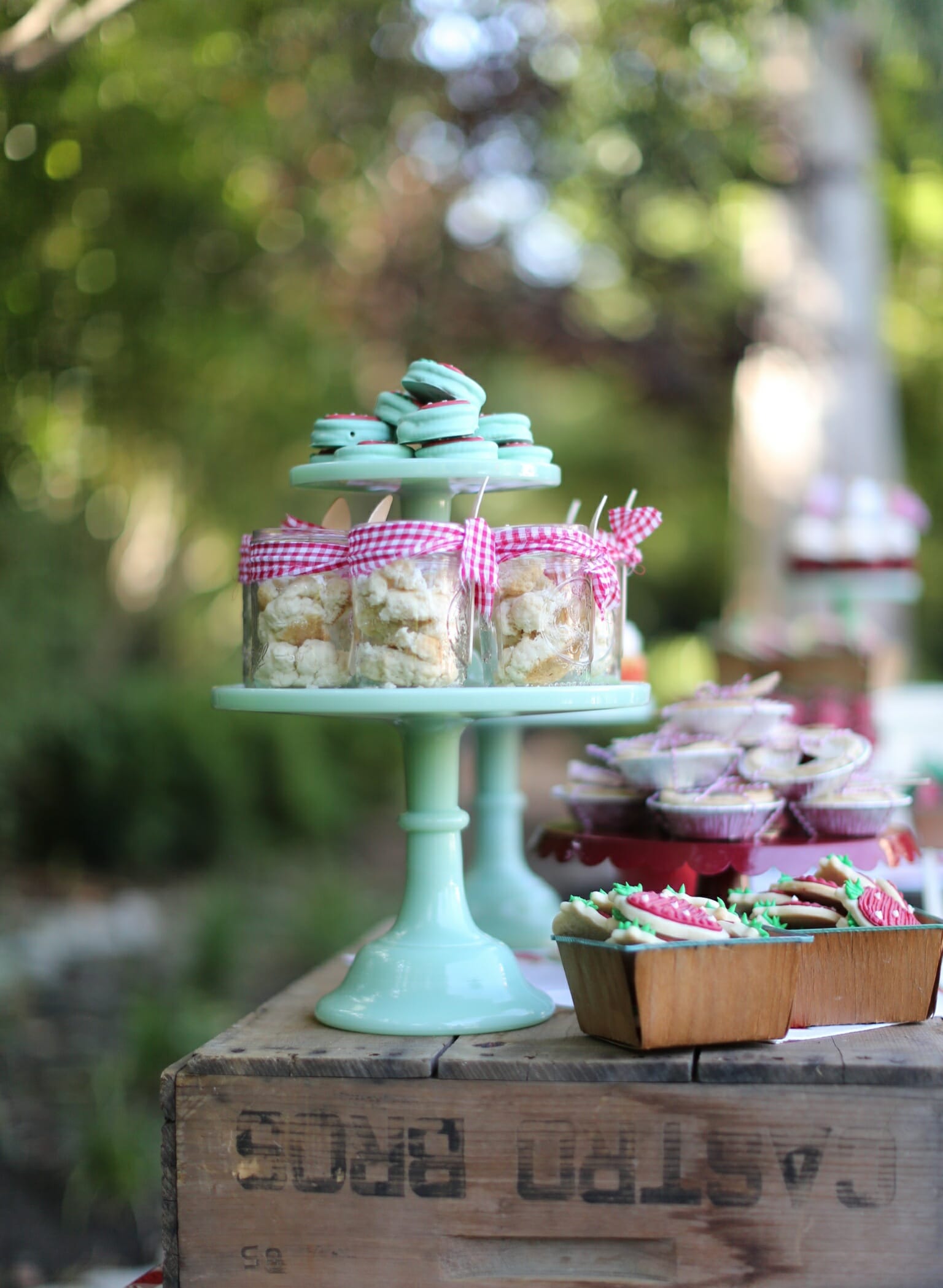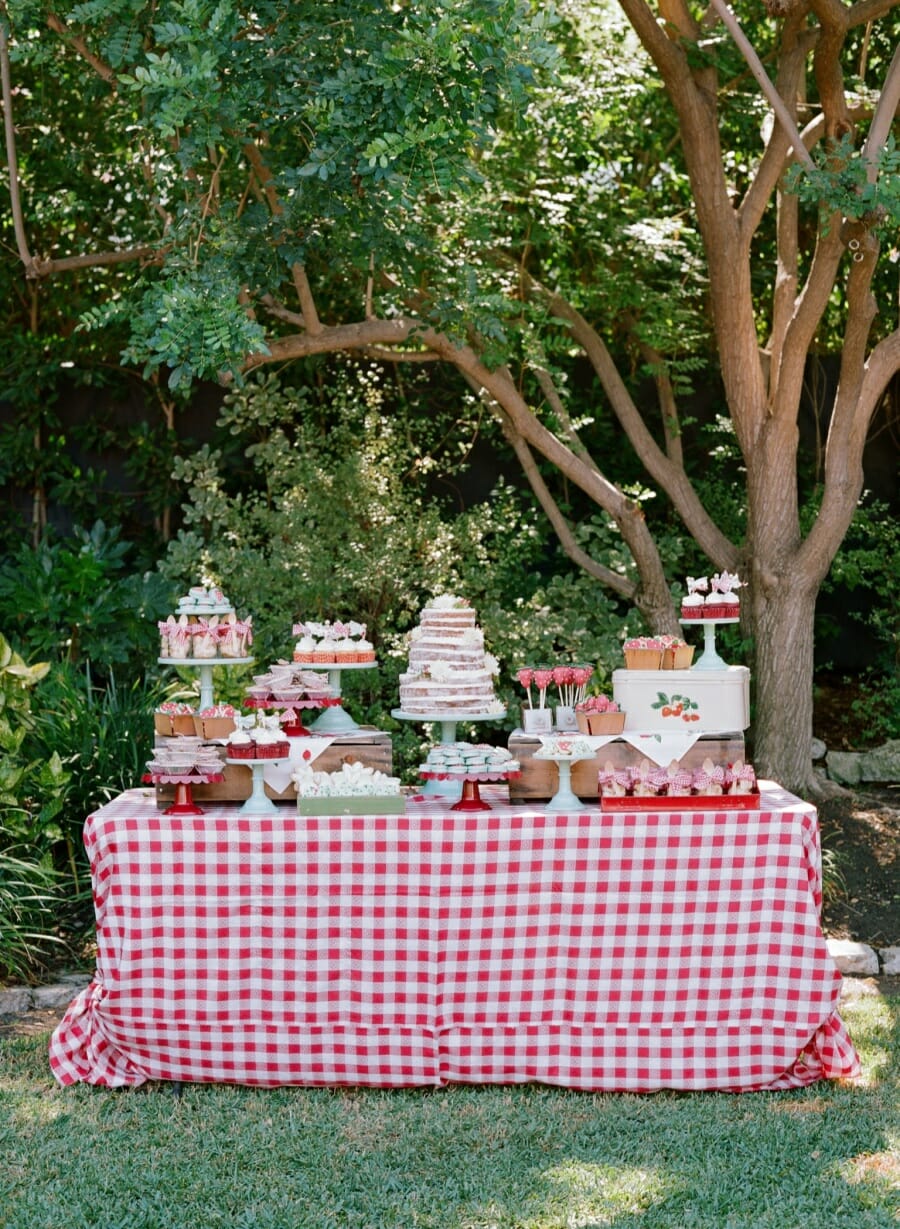 I baked mini strawberry pies tied in twine, strawberry shortcakes in ball jars, red velvet cupcakes with vintage fabric toppers, and strawberry shaped cake pops and sugar cookies. For Harper’s cake, I baked a naked cake filled with my favorite buttercream icing and topped with fresh blooms. It turned out stunning.