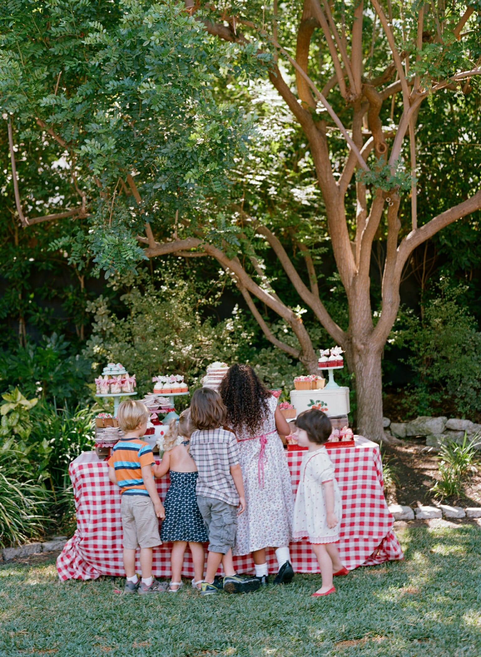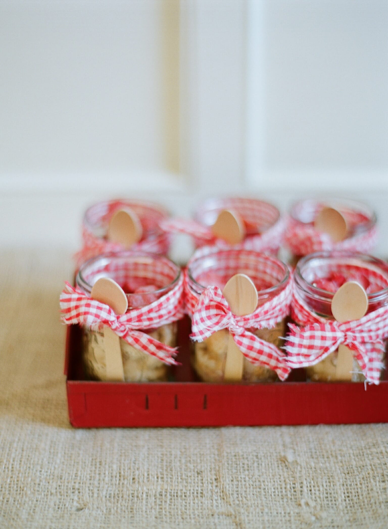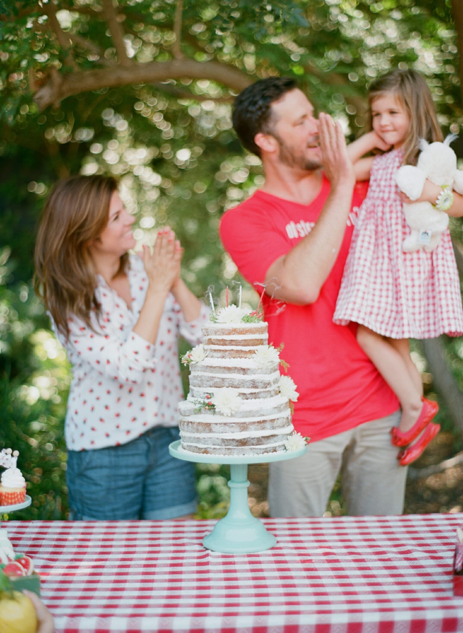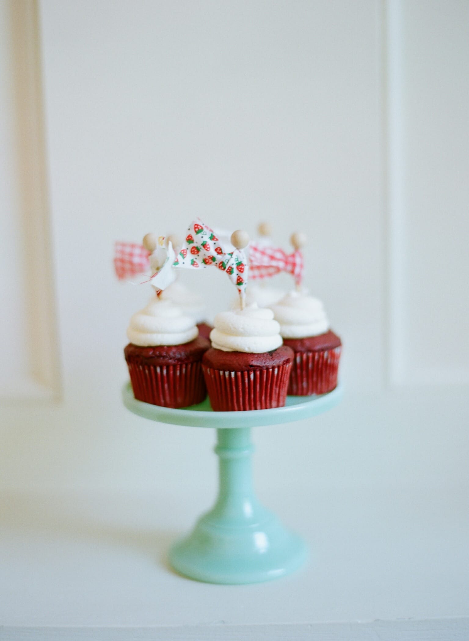 I baked mini strawberry pies tied in twine, strawberry shortcakes in ball jars, red velvet cupcakes with vintage fabric toppers, and strawberry shaped cake pops and sugar cookies. For Harper’s cake, I baked a naked cake filled with my favorite buttercream icing and topped with fresh blooms. It turned out stunning.