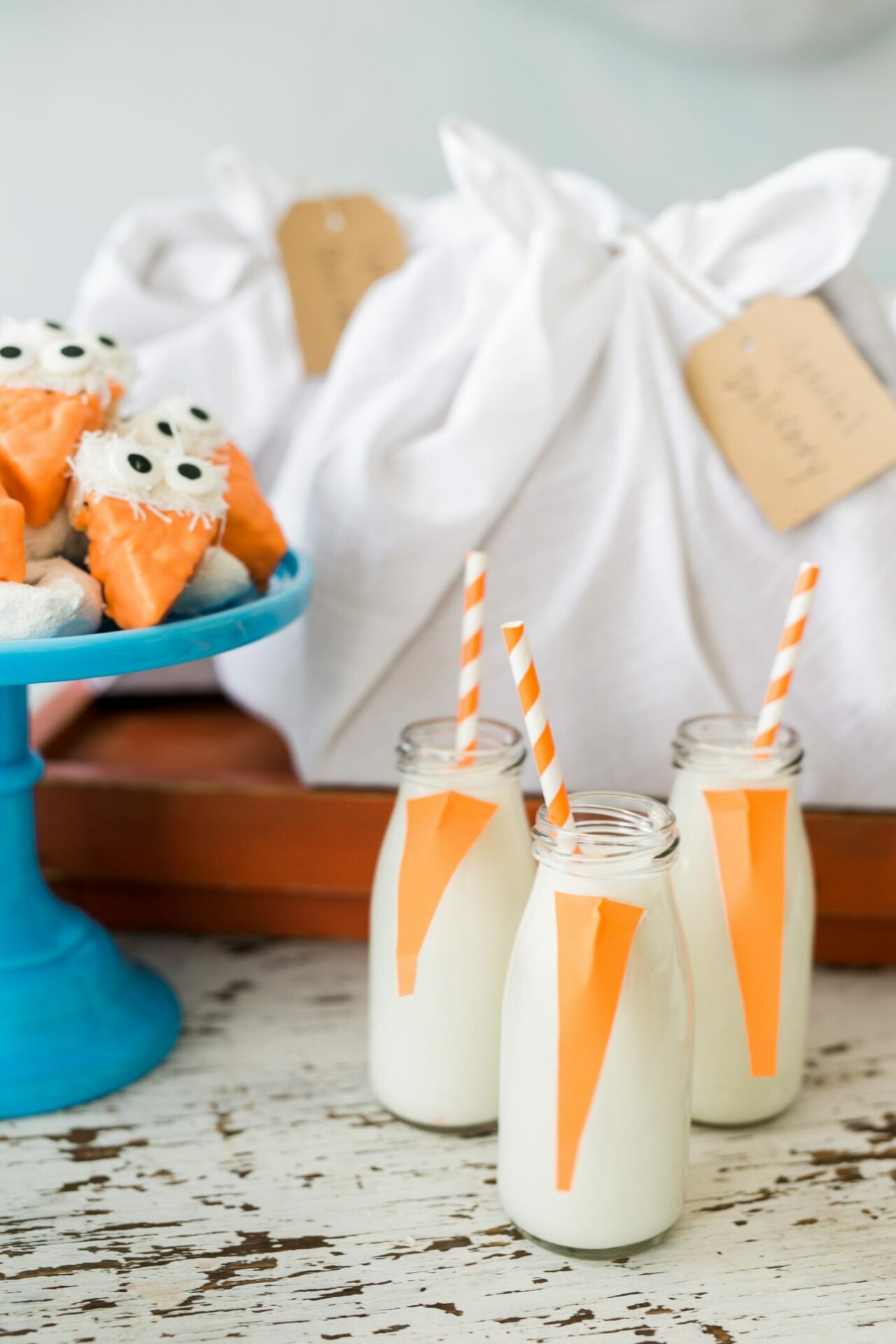 To wash down all the yummy desserts, serve milk in glass bottles. Using orange construction paper, cut beaks and attach to the glass with a hot glue gun.