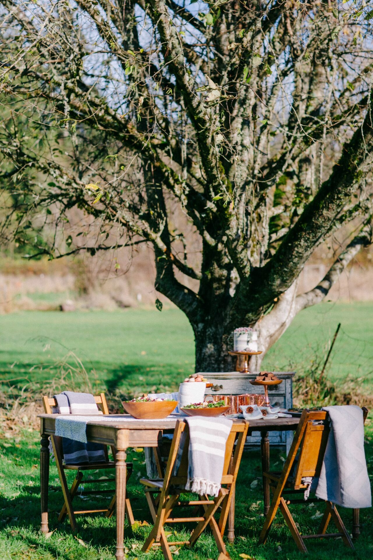 To soak up the last bit of sunshine here in Seattle, I set a table outside under one of our beautiful trees.Β In case it got chilly, I added a blanket to the back of each chair.Β If you live somewhere warm, you could leave the blankets out of the equation!