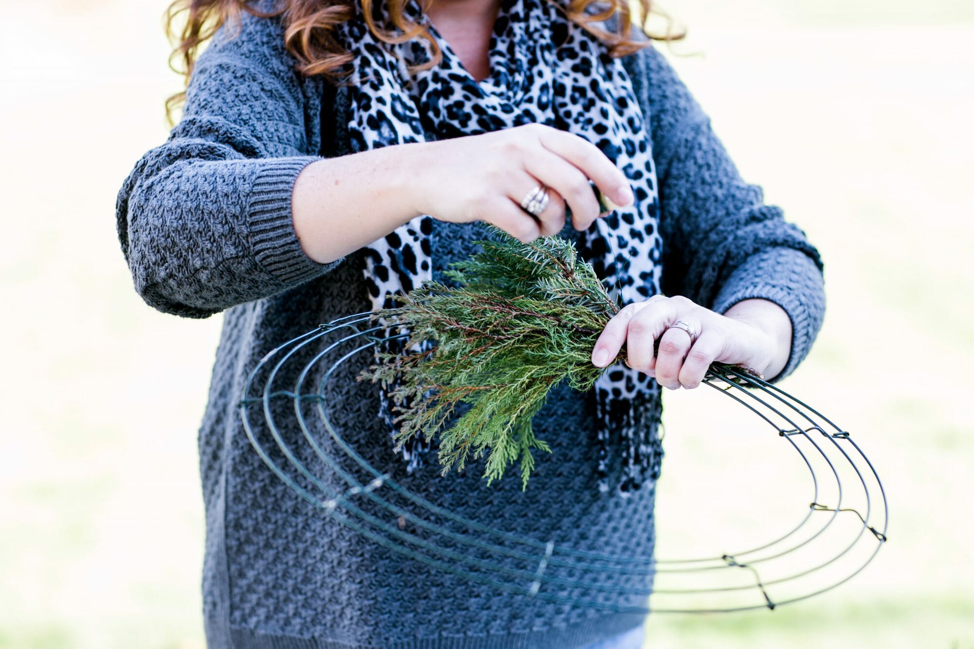Step 4: When you’ve covered your wreath in greens, wrap wire around your last grouping of greens, cut wire and wrap ends around wreath form as you did when you started.Β Make sure it’s nice and secure!