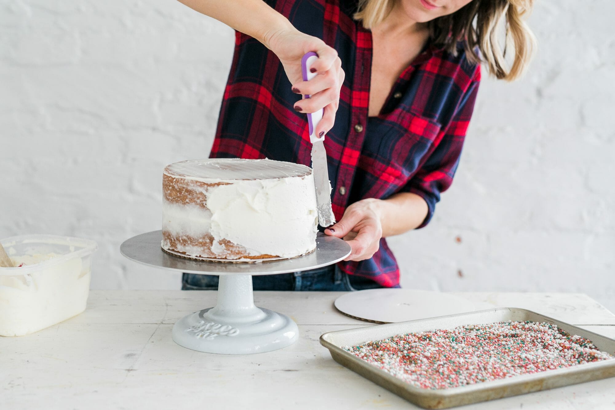 8. Use remaining buttercream to ice the top of the cake. Sprinkle the top of the cake.