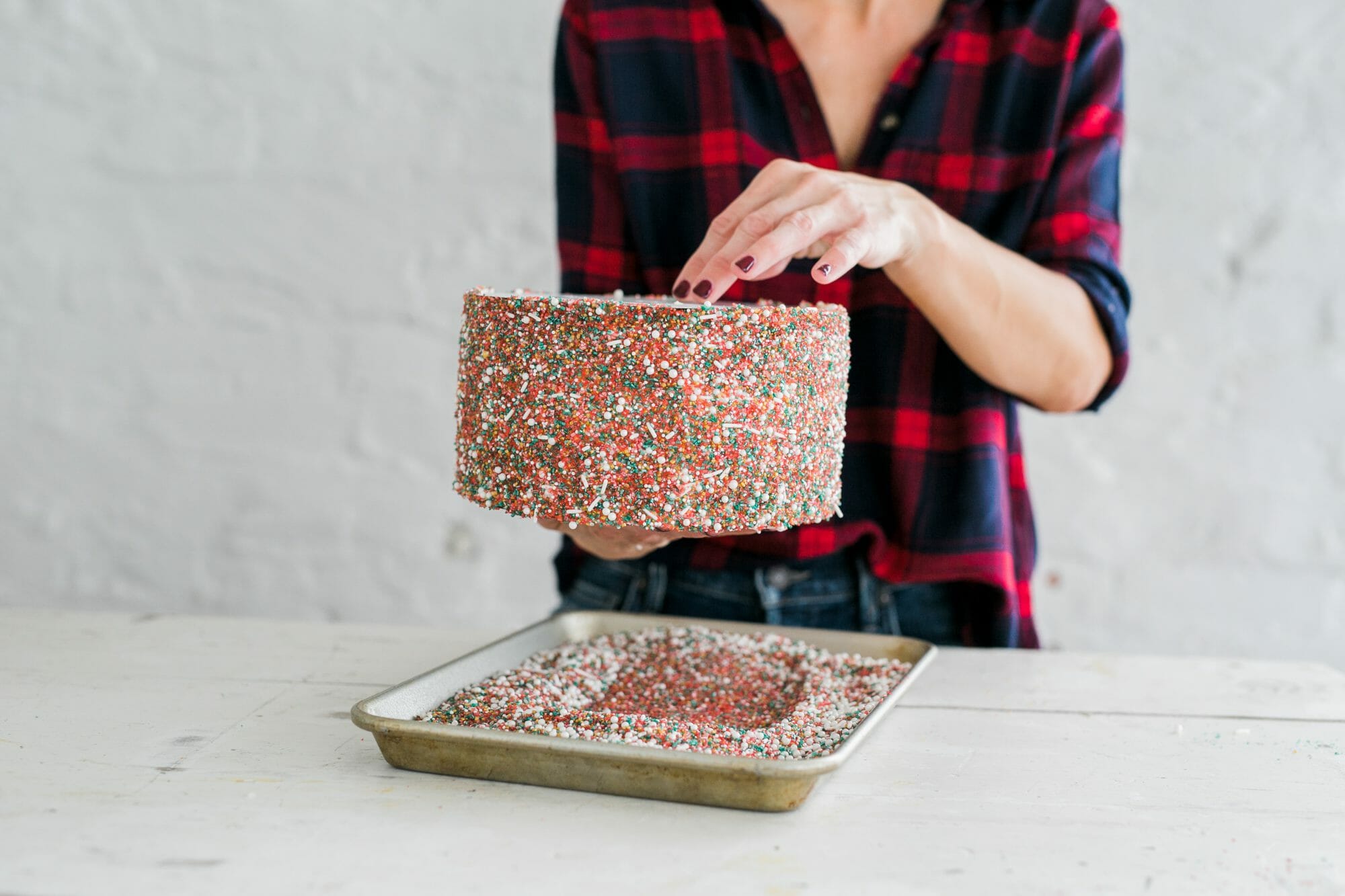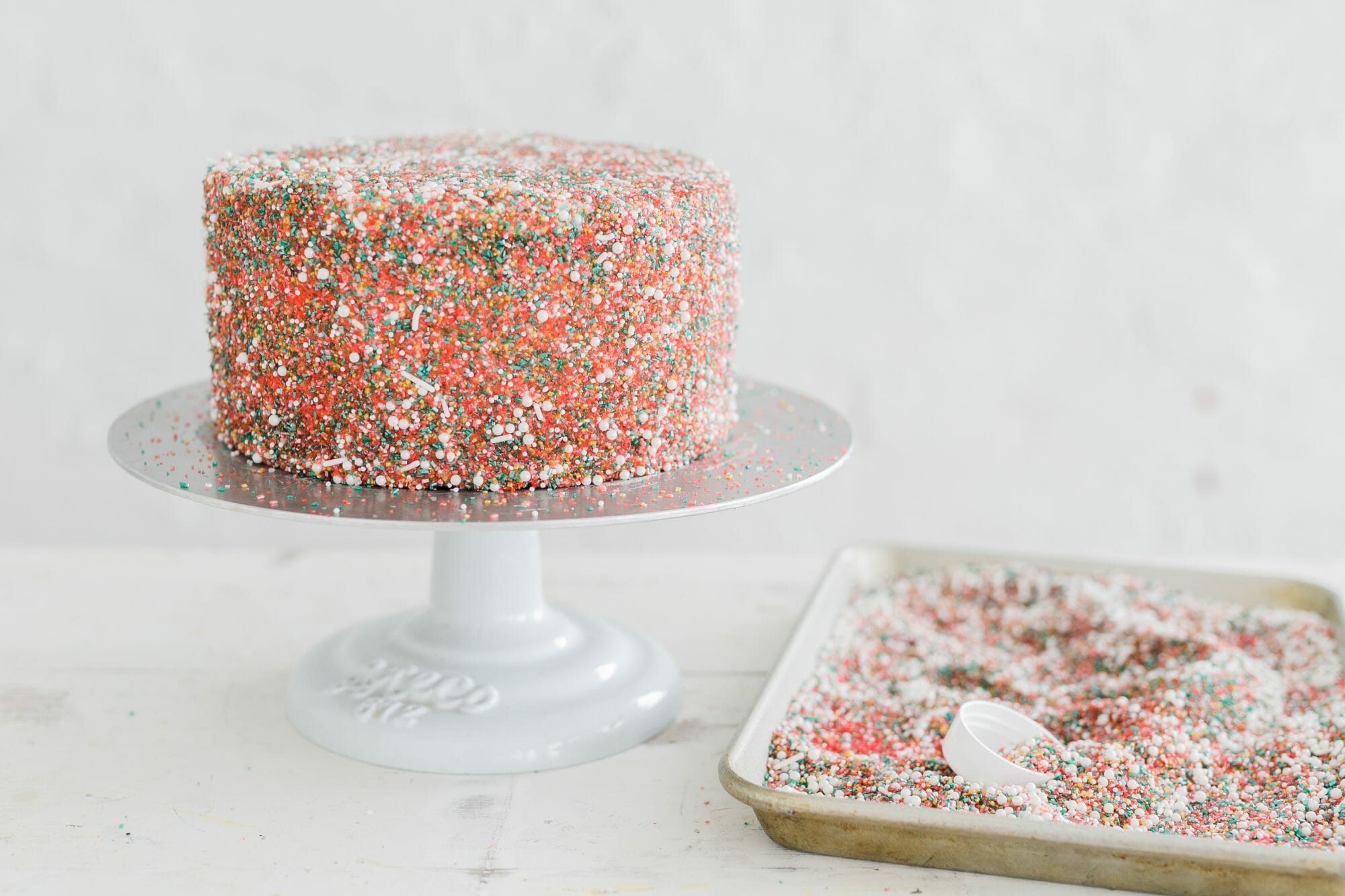 1. Start with an 8″ baked, filled and crumb coated cake in your favorite flavor, placed on a 8″ cake board. Let the crumb coat dry (about 30 minutes). Using a variety of sprinkles, mix them up and pour them into a jelly roll pan or small pan with an edge.