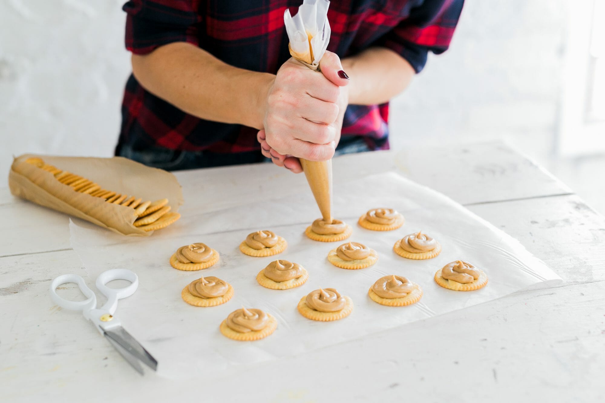 2. Place crackers on a sheet of waxed paper. Fill decorating bag with peanut butter. Snip tip of decorating bag about 1/4″ and pipe peanut butter onto crackers.
