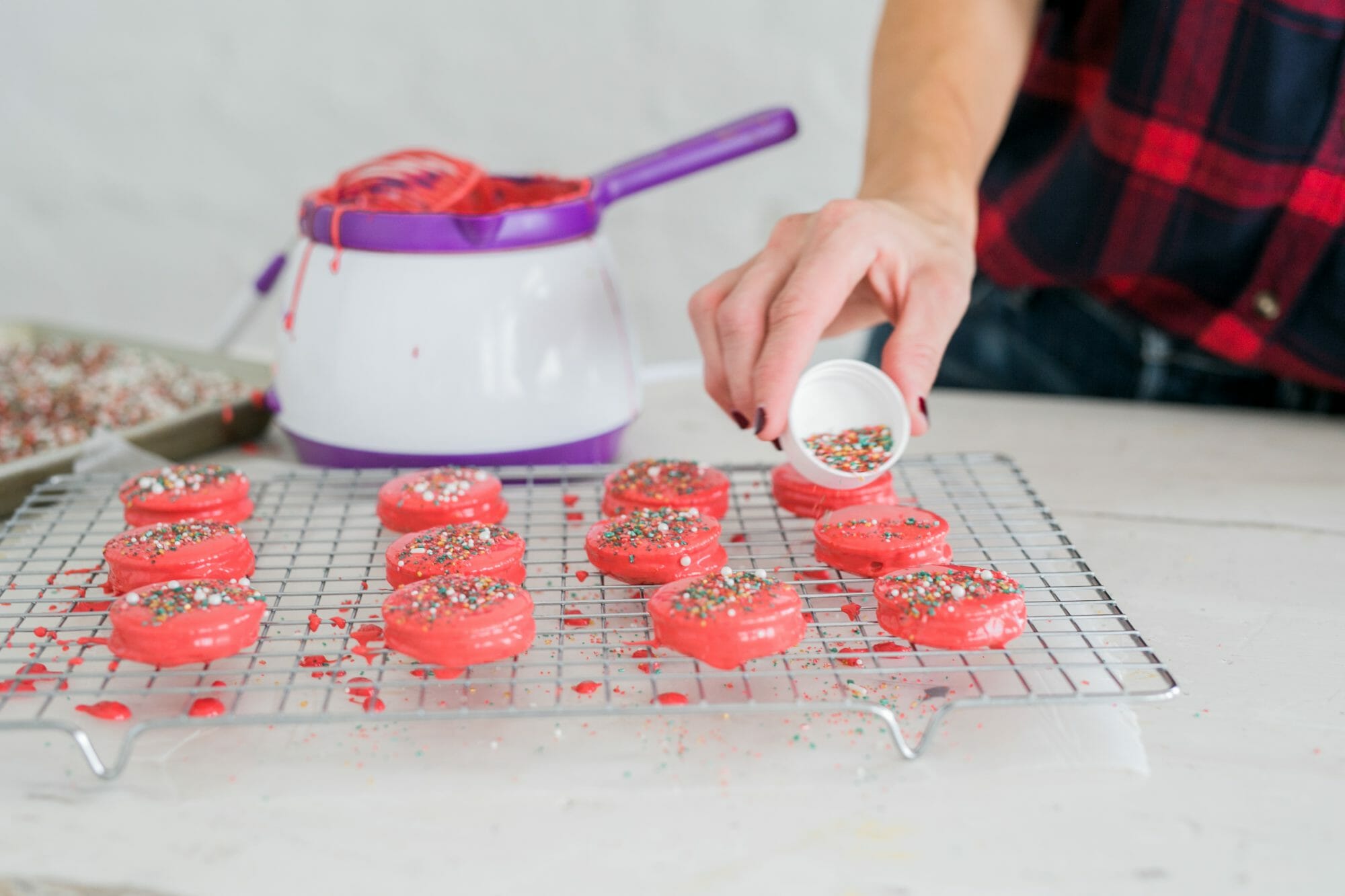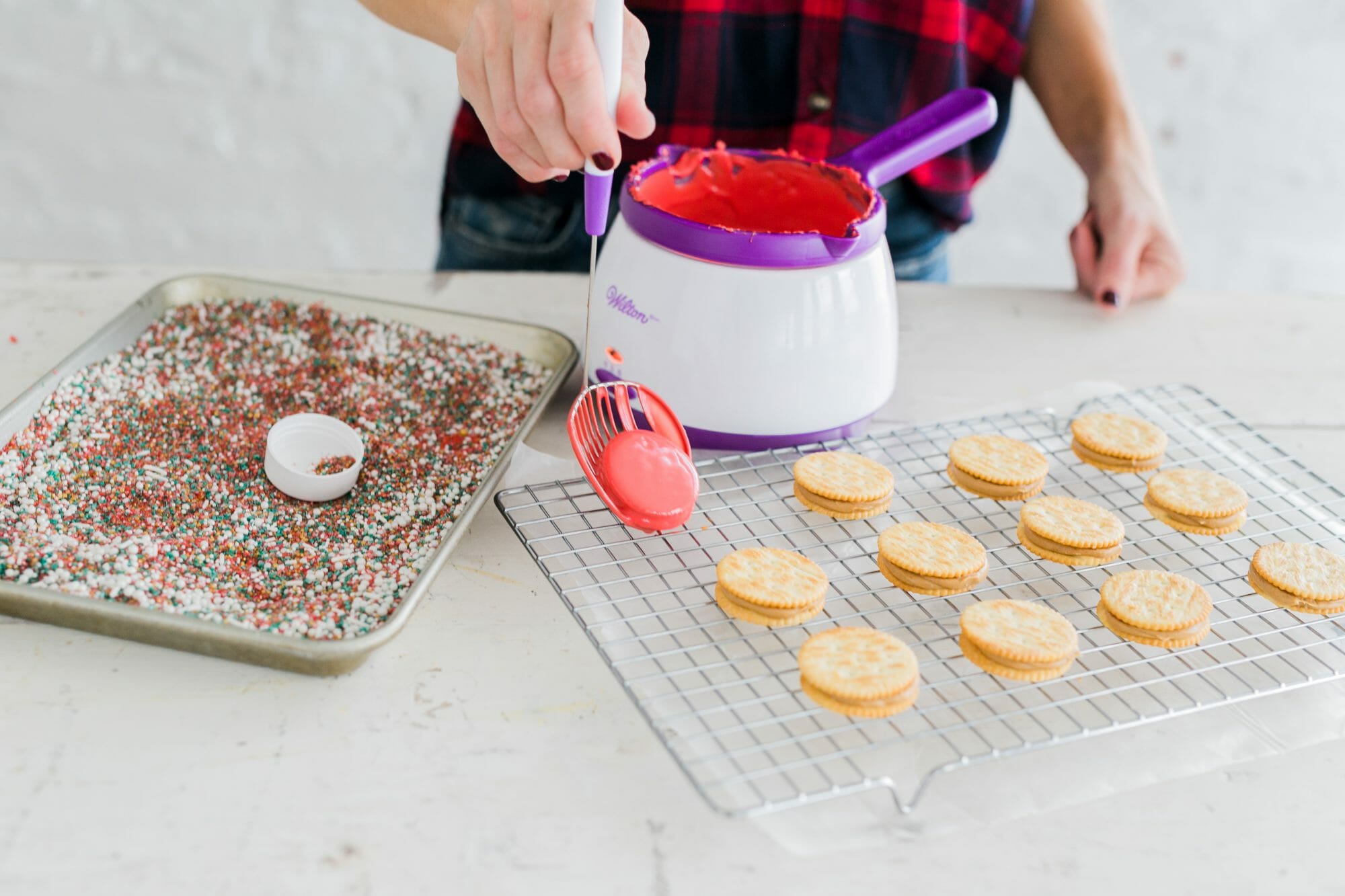 2. Hold cookie from the bottom or sides and place upside down into tray of sprinkles. Push cookie down into sprinkles to adhere sprinkles to buttercream icing.