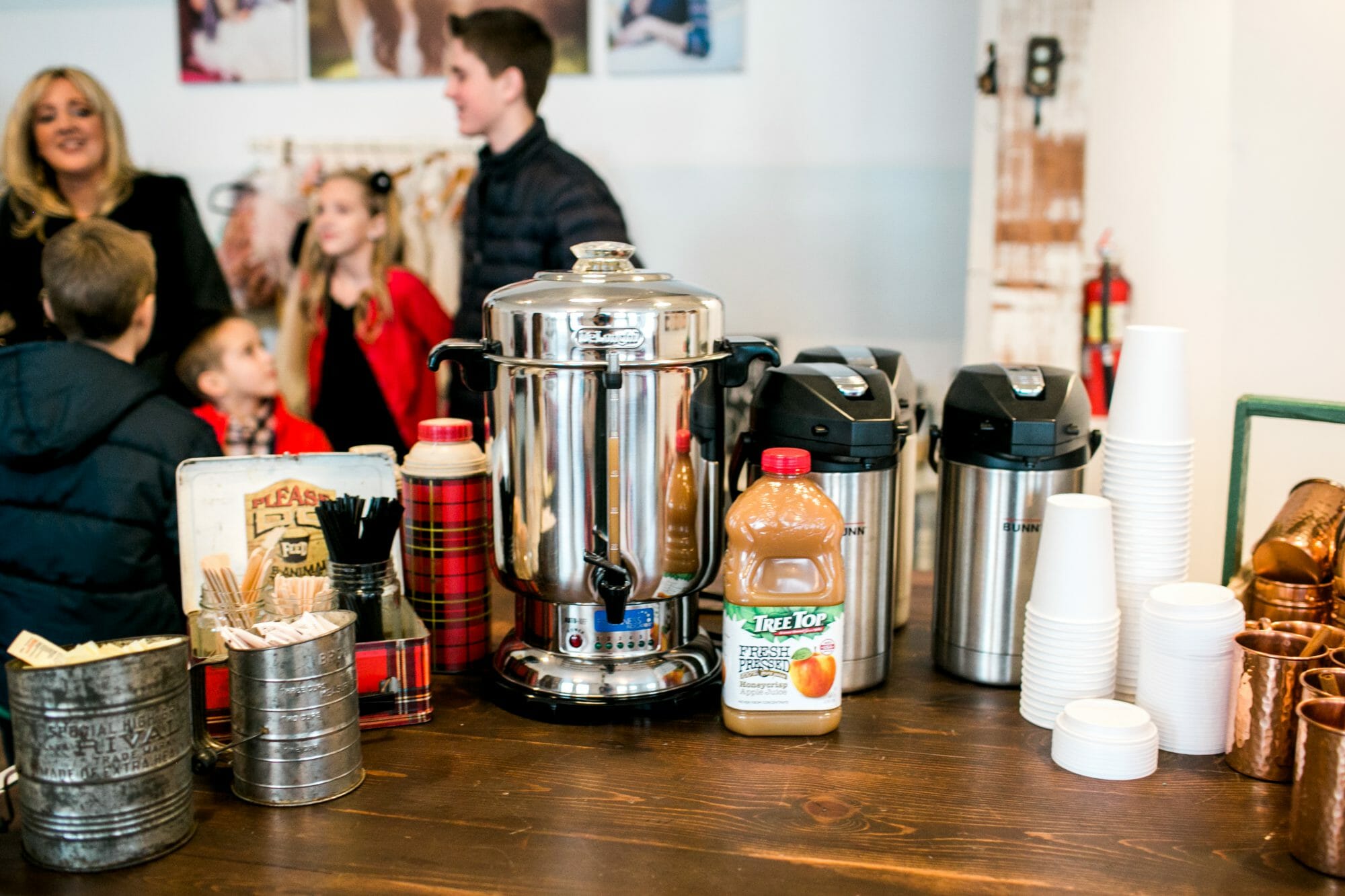 To wash down all of the sugar, we offered guests a hot apple cider and coffee bar. It may have been white and bright in the studio, but it was pouring down rain and dark outside. Hot apple cider was the perfect drink to warm everyone up!