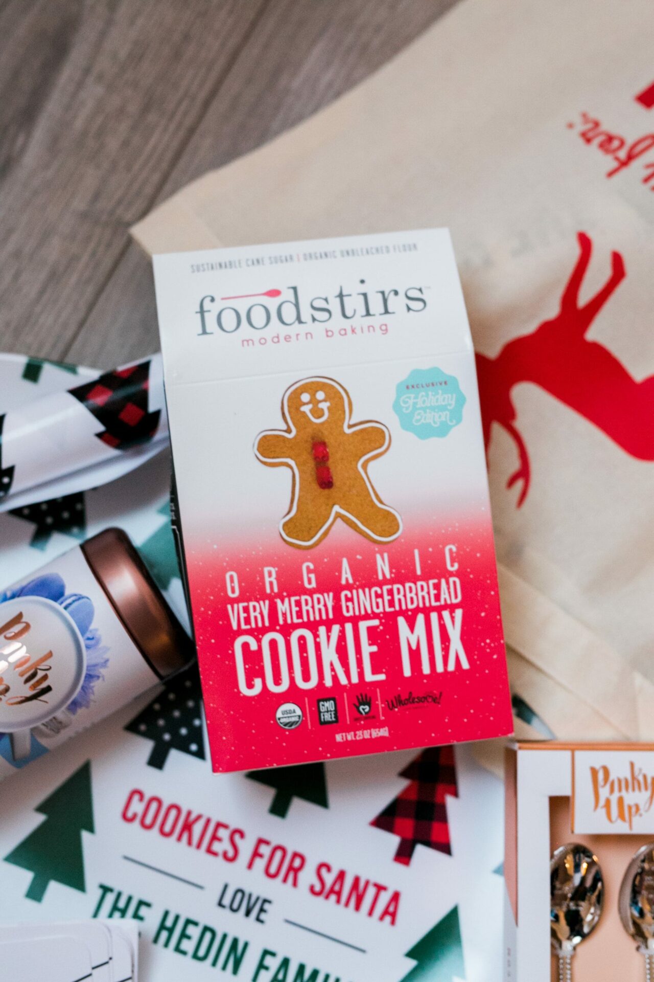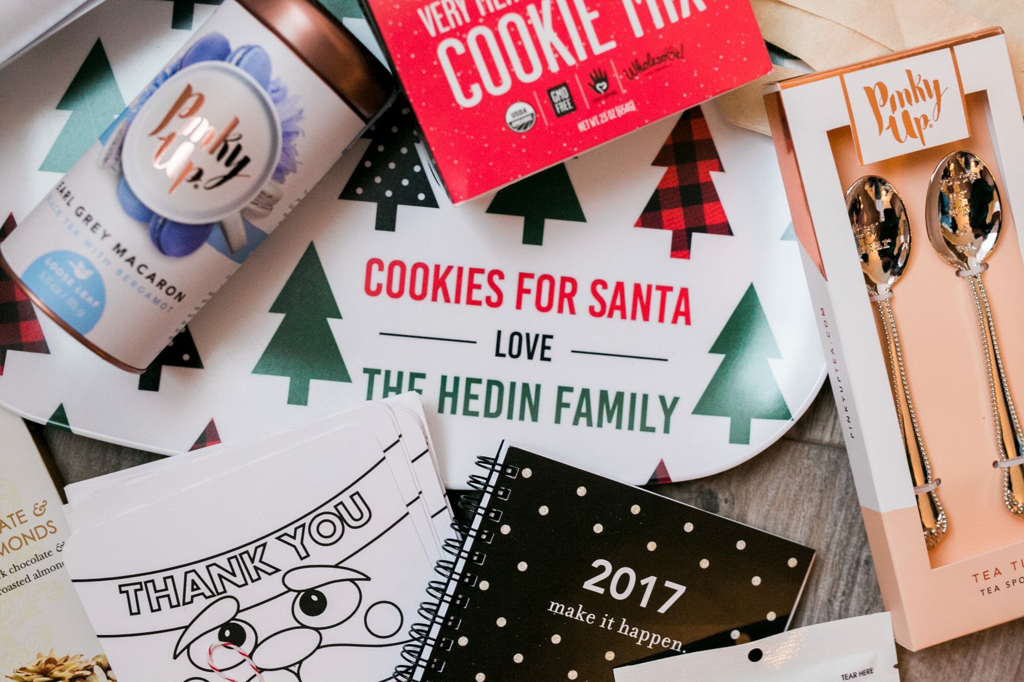 We also included a Gingerbread Cookie kit by Food Stirs. My sweet friend Sarah Michelle Gellar owns this awesome new brand. Her cookies are delicious! Other items in the bags were personalized Tiny Prints wrapping paper, thank you cards and 2017 notebooks. You can never have enough places to jot to-do lists! With Pinky Up Tea and coordinating spoons, Bissinger’s Chocolates and Gummies, the yummiest smelling candles by Candelles, and cinnamon and apple sauce ornament recipe cards, our guests are now set for a cozy holiday at home!