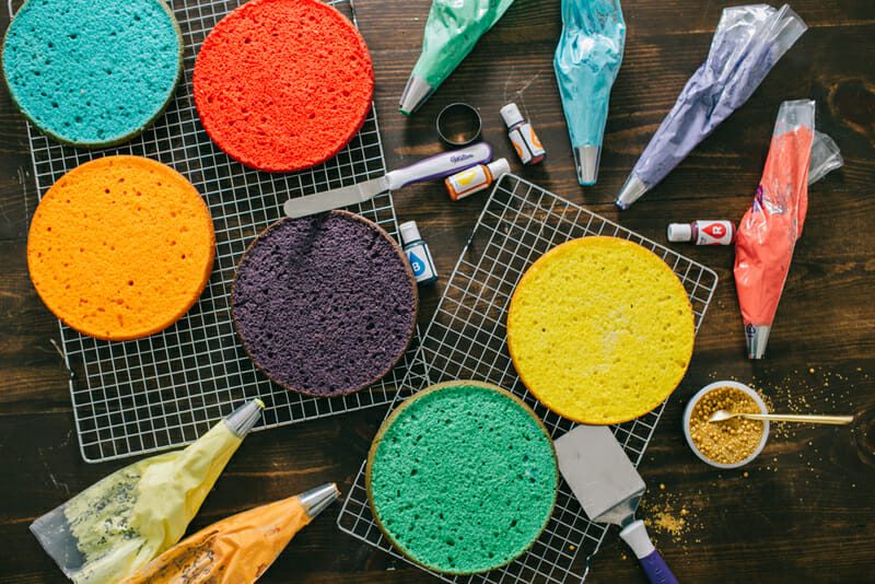 - While the cakes are cooling, make a batch of buttercream frosting. Reserve 1/2 of the frosting into a separate bowl for filling and crumb coat. Separate remaining frosting into 6 bowls. Using Wilton Color Right System, color each bowl of frosting a color of the rainbow (red, orange, yellow, green, blue, purple).