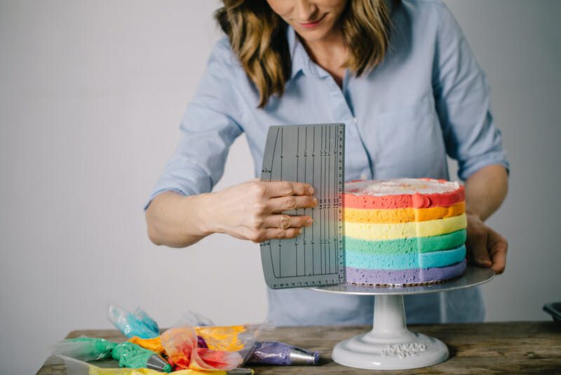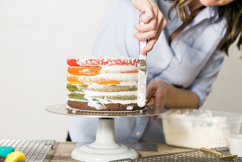 - Place an 8” cake board onto a cake turntable. Place the purple cake layer on board. Spread a thin layer of icing on top of cake using an angled cake spatula. Stack blue layer on top. Spread a thin layer of icing across the top of the blue cake. Repeat steps with green, yellow, orange and red layers.