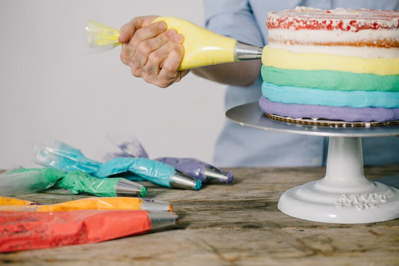 - Starting with the purple icing bag held in a horizontal position, begin applying purple icing around bottom of the cake with even pressure while turning cake table with opposite hand. Repeat layer with blue icing and continue through remaining rainbow colors.