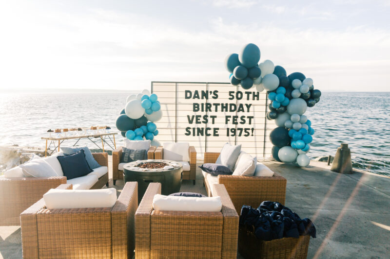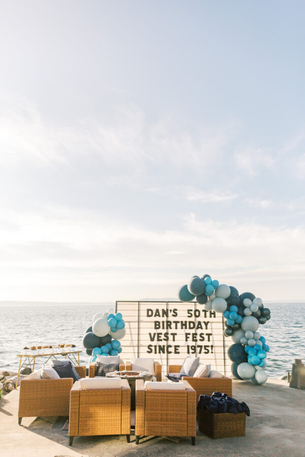 I kept décor simple, focusing on a blue color palette that felt masculine but still celebratory. I added pillows to outdoor furniture, hung our Vestival posters around the party, and created one major centerpiece: a massive vintage marquee theater sign from Wordsmith that read “Happy 50th Birthday Dan, Vest Fest, Since 1975.”