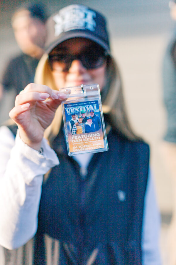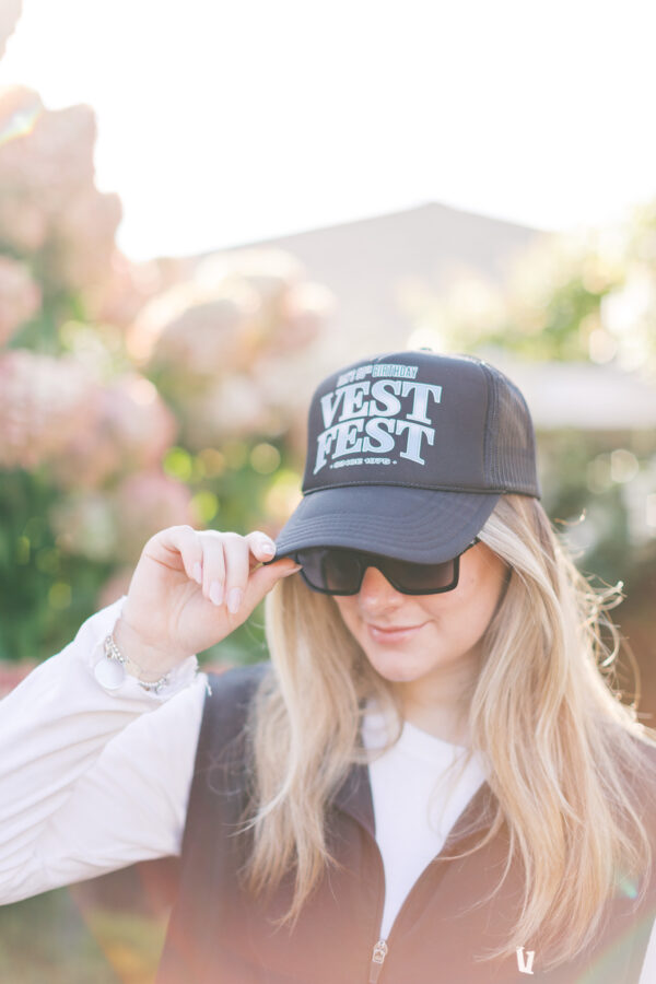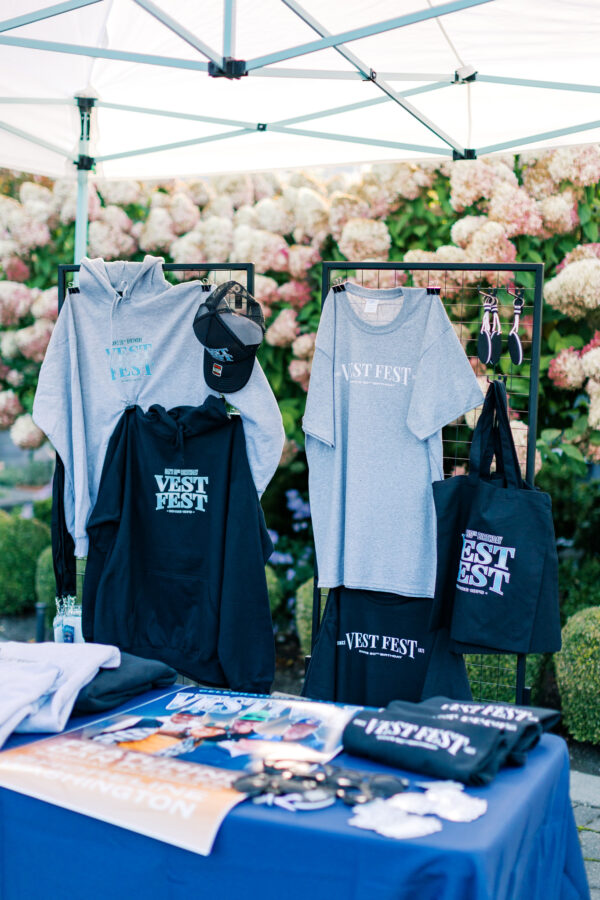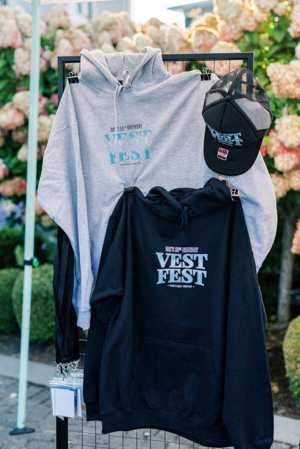 My absolute favorite part of the Vestival? The merch booth. I knew it would be a hit because Dan STILL wears Ally’s 16th birthday sweatshirt years later. So I went all in and created custom merch for his big day, tees, hats, hoodies, tote bags, posters, even stickers. I set it up just like a booth at a concert. Guests loved grabbing a piece of Vest Fest to take home.