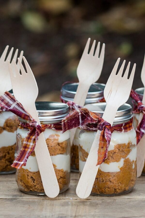 - Tie a wooden fork around the top of each jar with a strip of fall fabric.