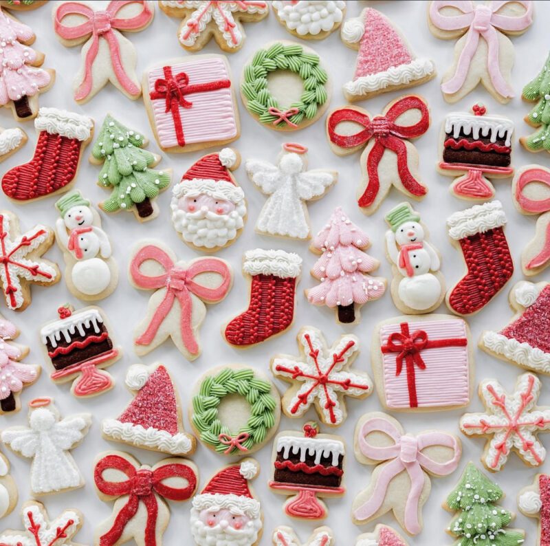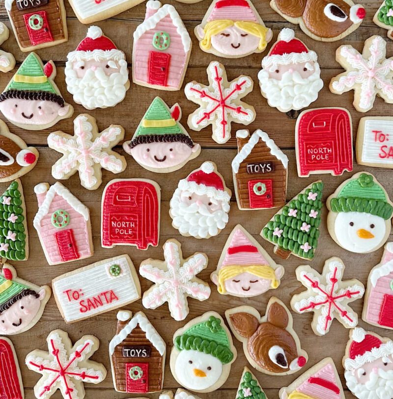 Over the years, I’ve decorated hundreds of sugar cookies for holidays, birthdays and everything in between. I’ll be sharing photos of some of my past Christmas sets in this post along with step-by-step instructions, my go-to sugar cookie recipe, and all the supplies I use. You’ll also find a link to my Cookie Class cookbook, where I go even deeper into piping, coloring, and decorating techniques if you want to learn even more!