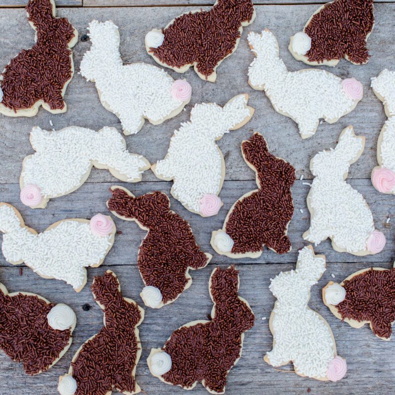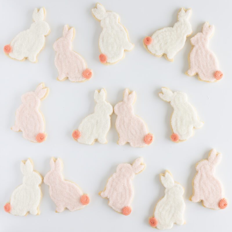 I love to decorate my Easter bunnies with soft pastel frosting and dip them in jimmies or sanding sugar for some added texture. I also love piping the tail with a small star piping tip to keep it looking fluffy.