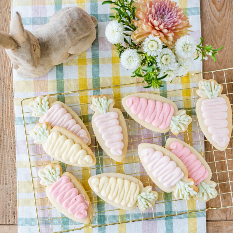The chicks were actually really simple and fun to make. I piped them with pale yellow buttercream using the same round 12 tip as the carrots so they stayed thick and round. I didn’t overwork the details. Just small faces, legs and a daisy headband. These will always be one of my favorite Easter sugar cookie shapes!