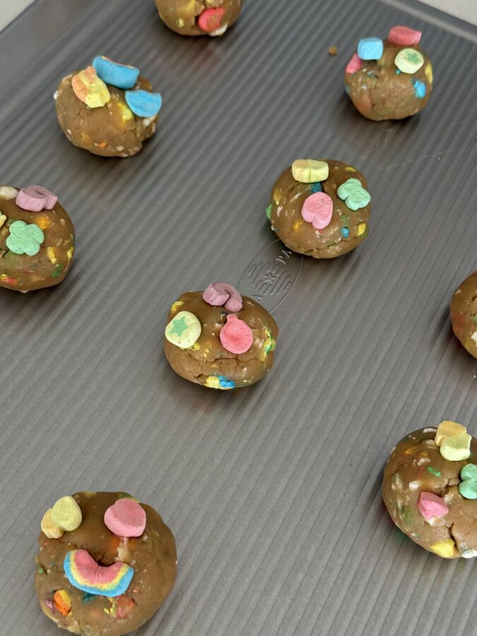 - Press a few Lucky Charms marshmallows into the tops of the dough balls.