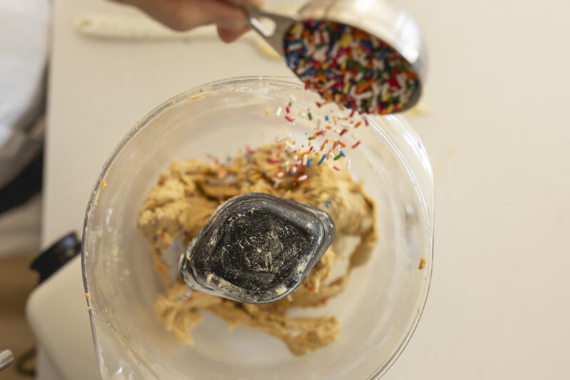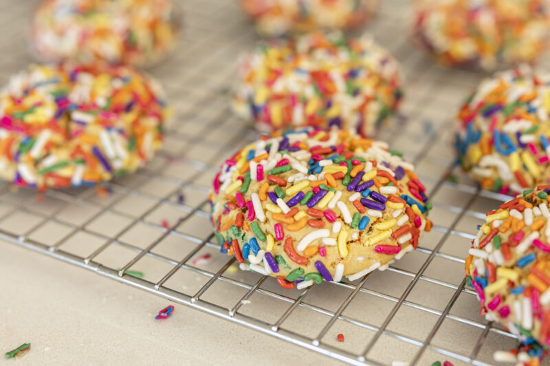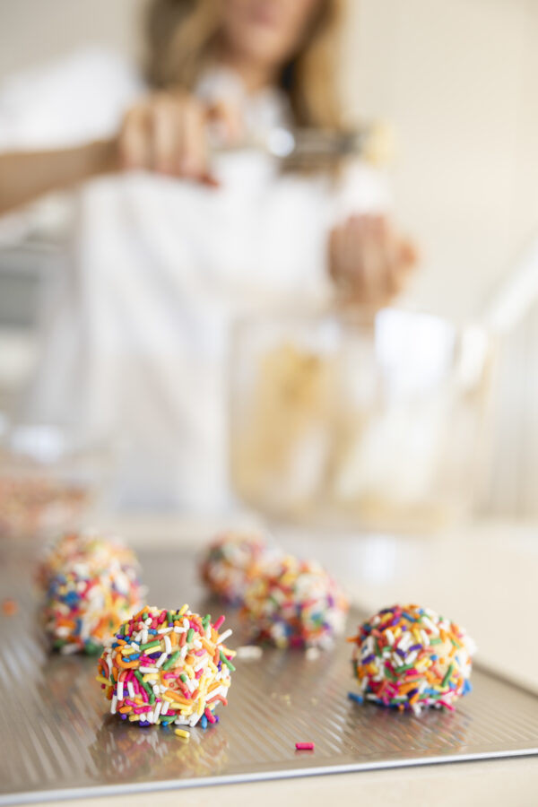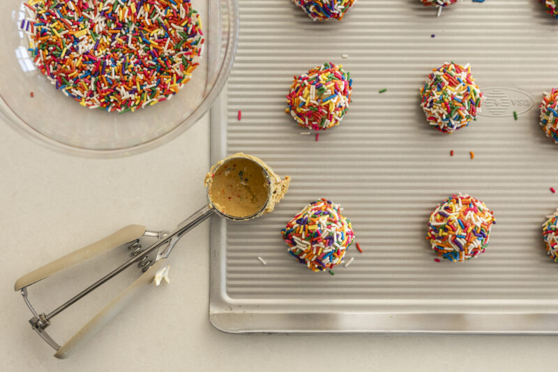 - Scoop 2–3 tablespoon-sized dough balls and roll in extra sprinkles.