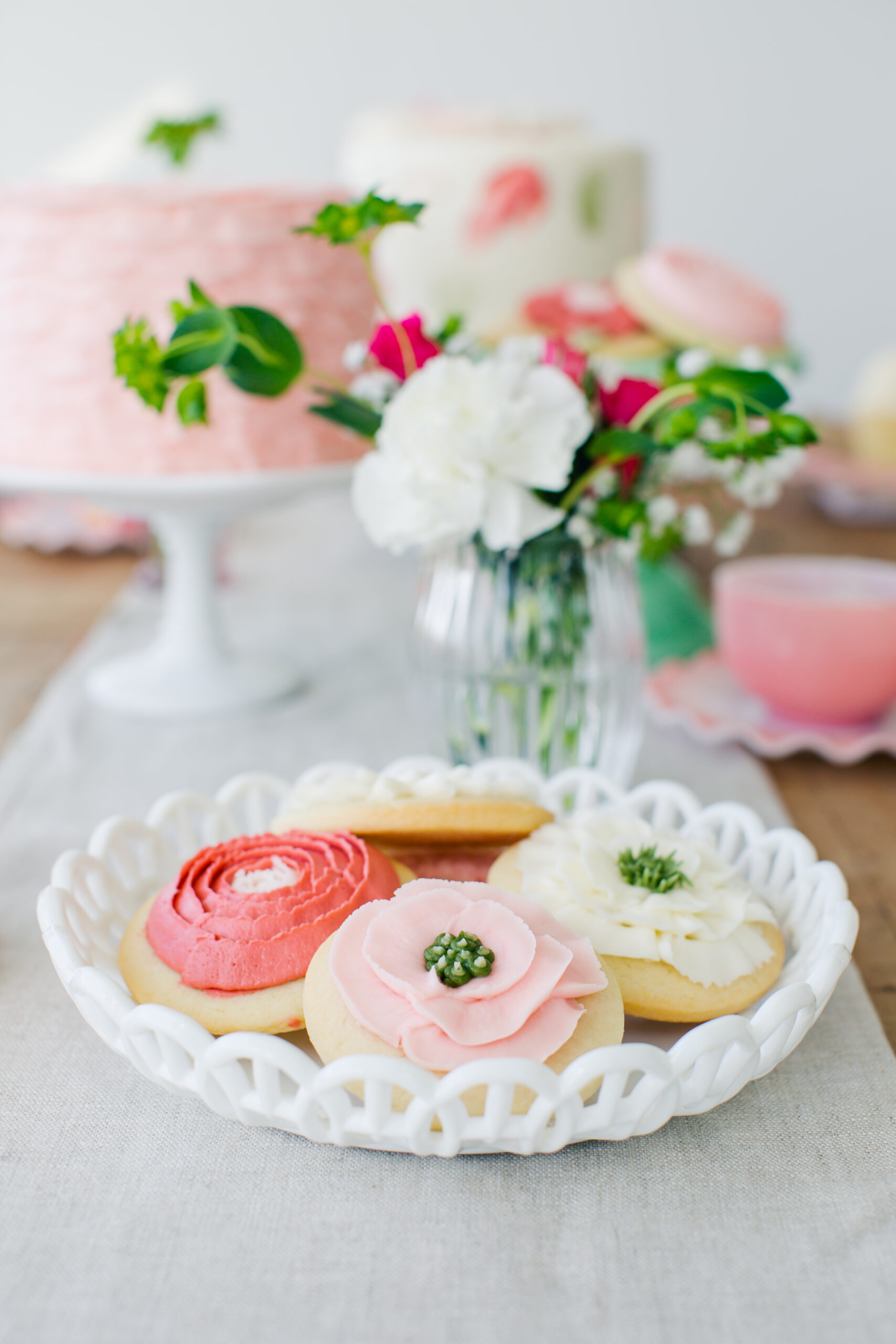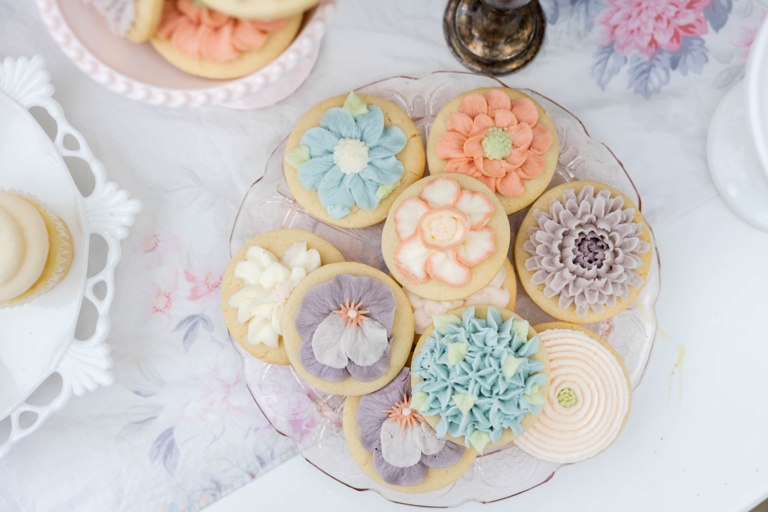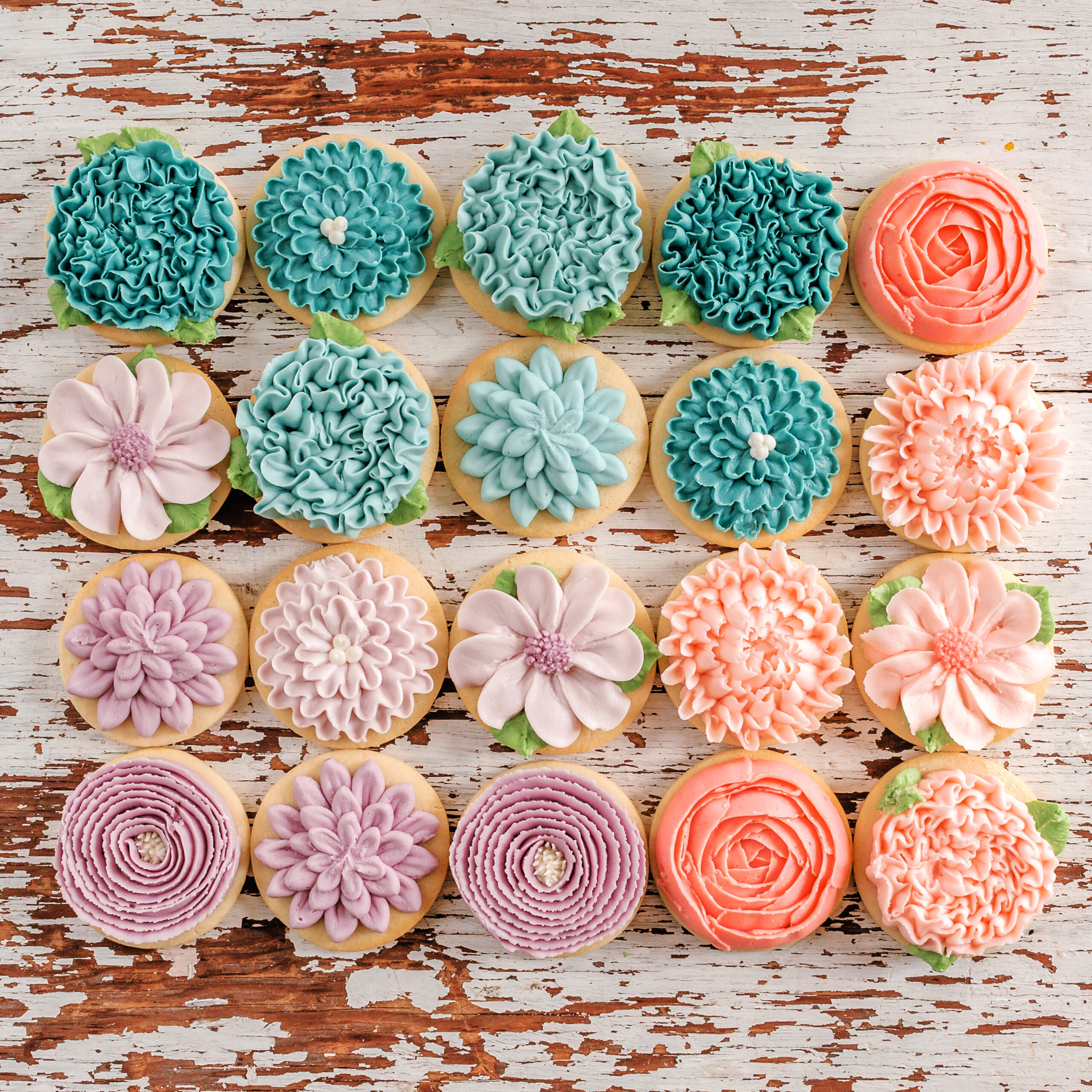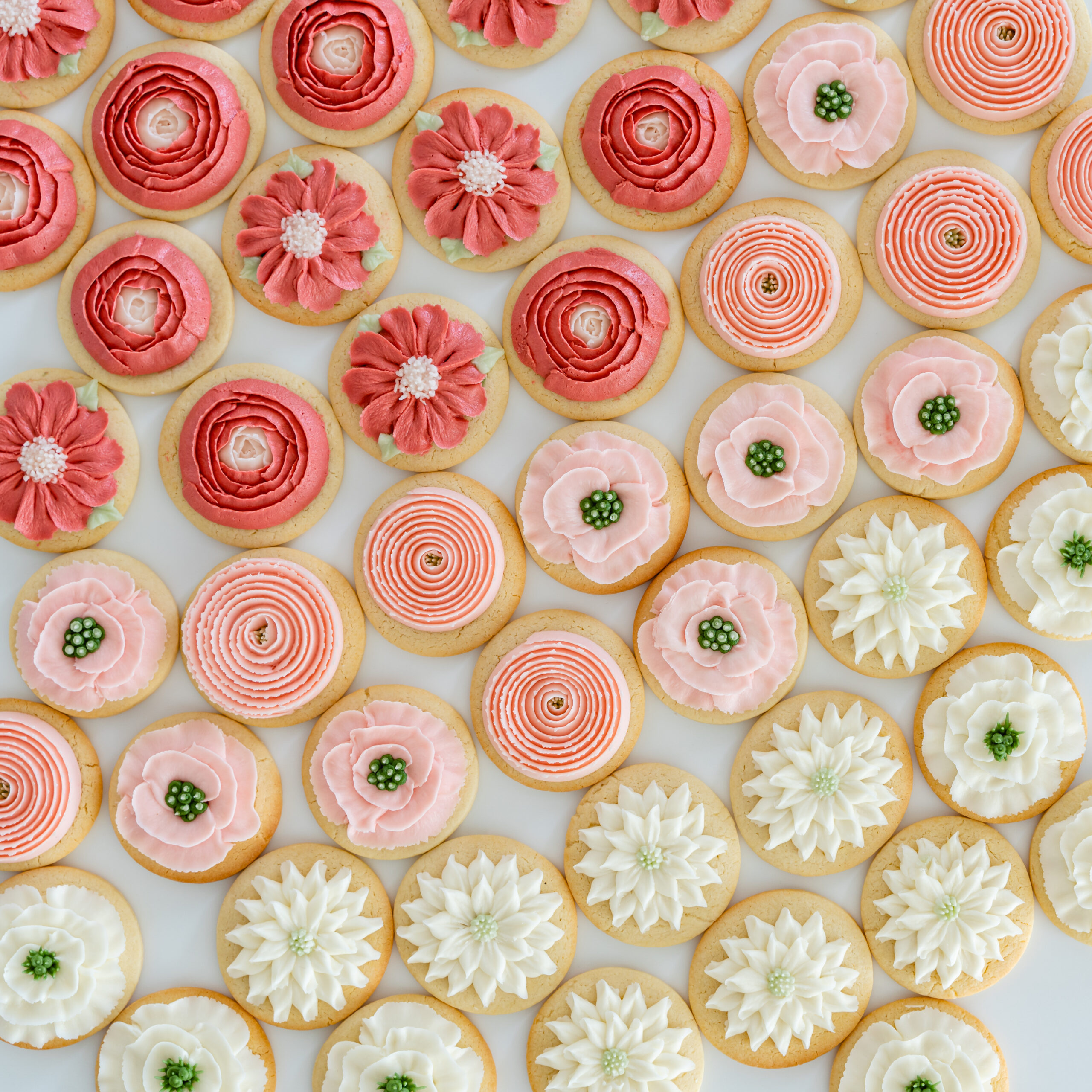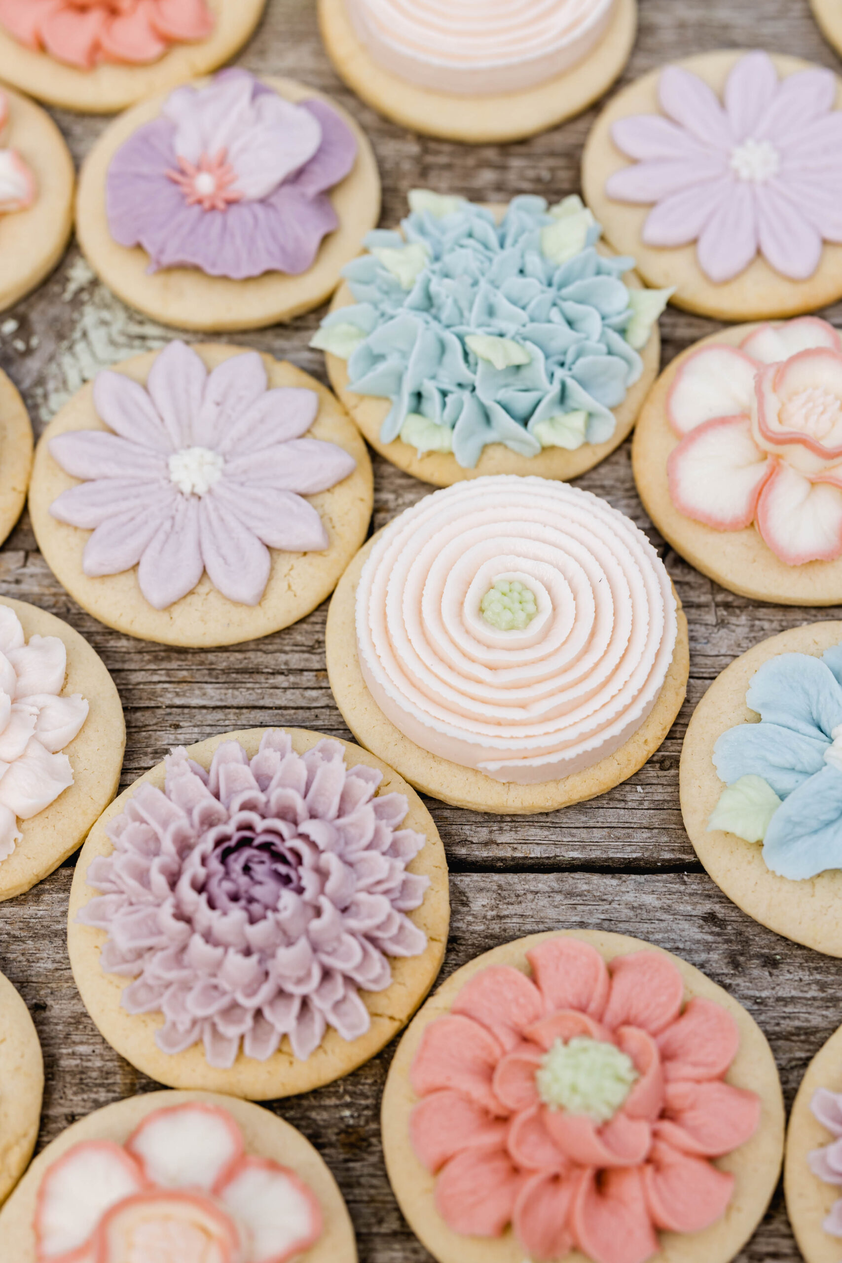Start with a simple round cookie, then pipe small buttercream flowers directly on top. You can keep them monochromatic or mix in a few soft spring tones.
